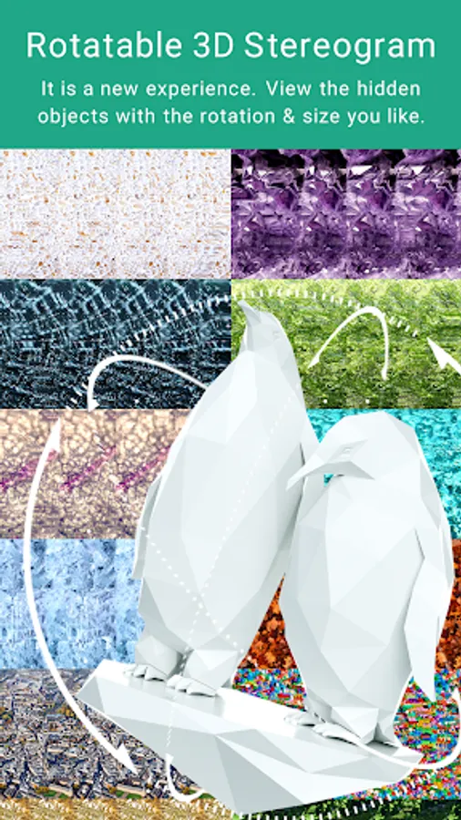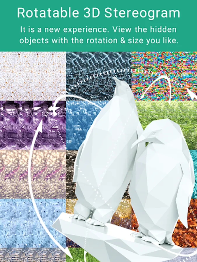 This is a app to view 3D images called the single-image stereogram, autostereogram or magic eye. You can see the stereoscopic images with the naked eye without using special goggles or glasses. See the screen with a gaze like looking far ( Parallel View Method ) or with crossed eyes ( Cross View Method ). The way to view is explained in detail in the app.