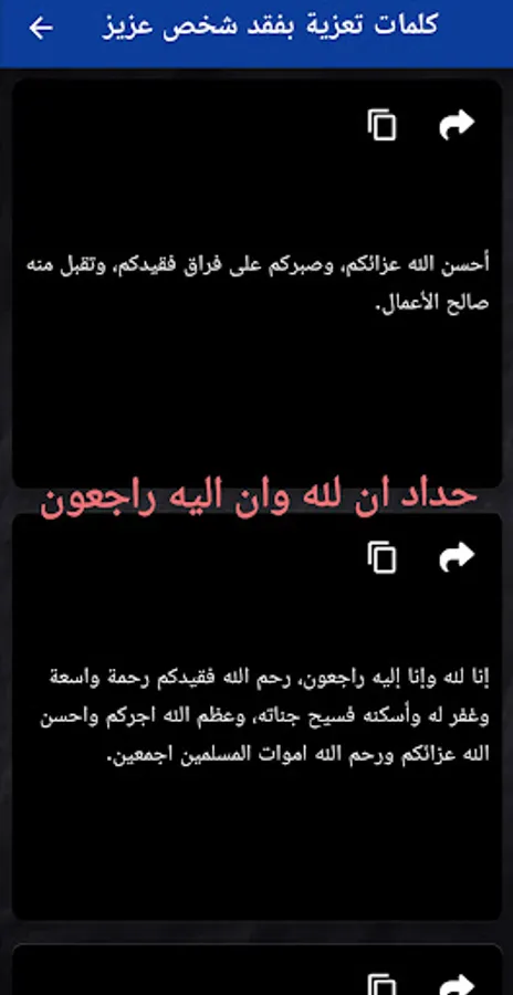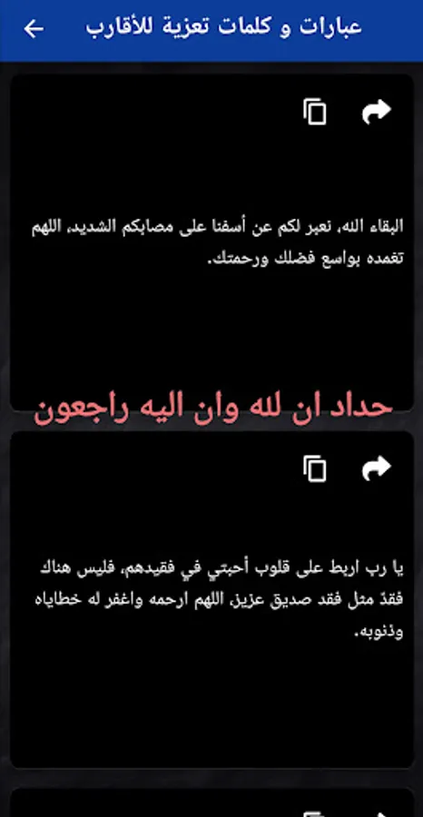 Cards: To Allah we belong, and to Him we shall return. The application provides a set of features that help users deal with grief and mourning, and express their sympathy and support to bereaved people. The application contains a collection of religious phrases and supplications that can be used as condolences and support for the bereaved and to express compassion and remembrance.