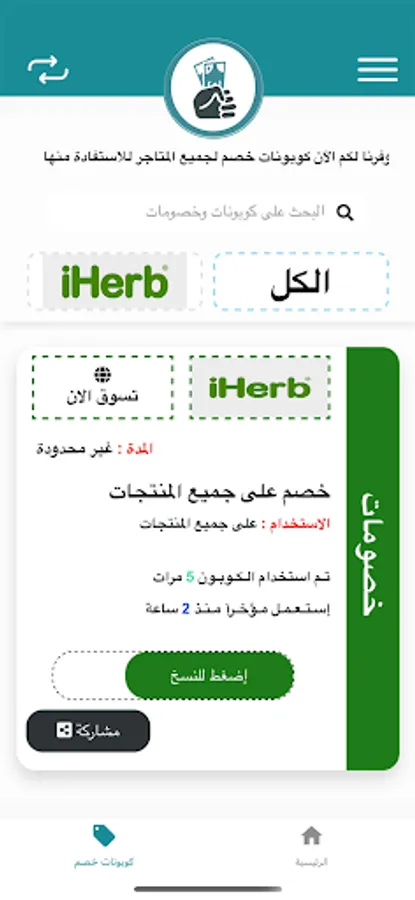* Discount coupons for stores (iherb - noon - Namshi - Centrepoint.....) and many stores