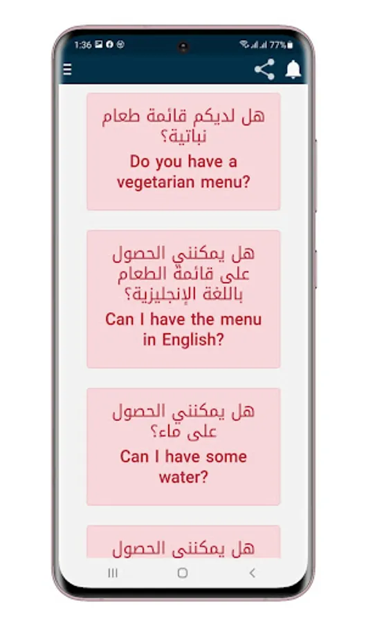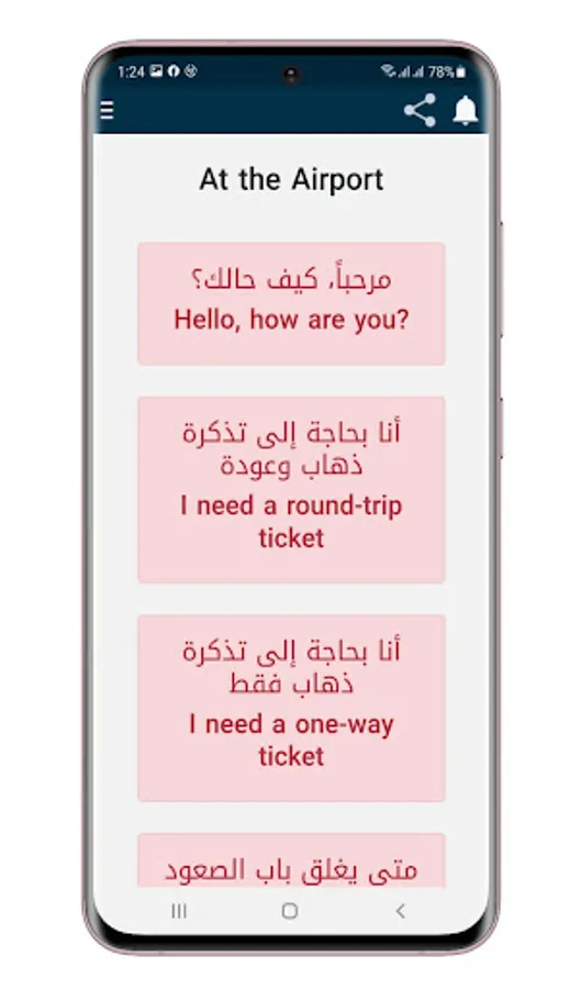 Immerse yourself in the language with our high-quality audio recordings by native Arabic speakers. Listen to the accurate pronunciation of each phrase and word, and practice speaking aloud to improve your fluency. Whether you're a beginner or an intermediate learner, this app provides a solid foundation for your Arabic language journey.