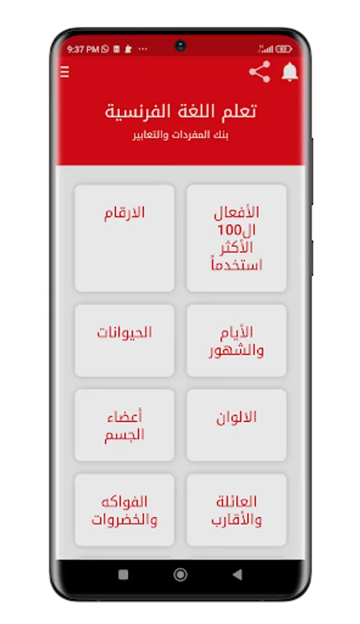 Thanks to the huge database available in the application, you can enjoy a large collection of French words and common phrases in the French language. Whether you are preparing for a trip to France for study, tourism, or others, or want to improve your career opportunities, our application provides you with basic vocabulary and useful phrases in groups arranged according to topics that help you learn the French language from scratch and step by step, which are as follows