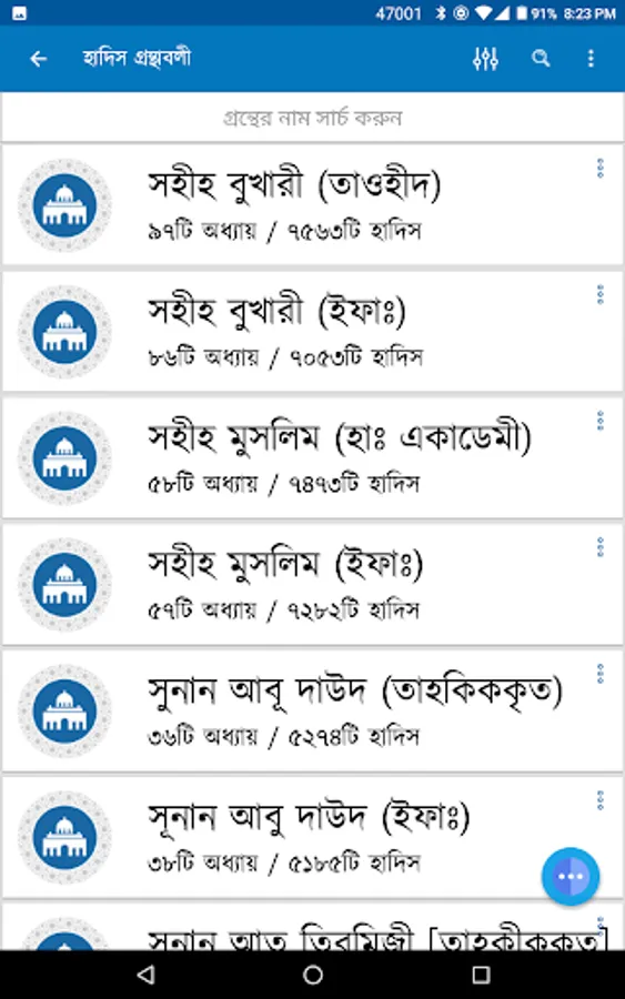⯎ সর্বমোট হাদিসের গ্রন্থ রয়েছে ২৫ টি (একই গ্রন্থের বিভিন্ন অনুবাদ রয়েছে) এবং এতে ৮৪ হাজারেরও অধিক হাদিস রয়েছে।