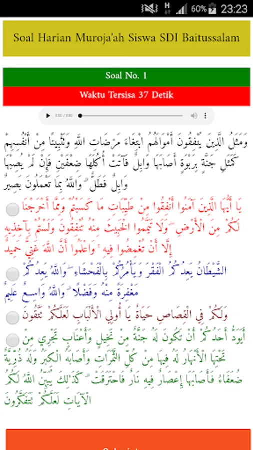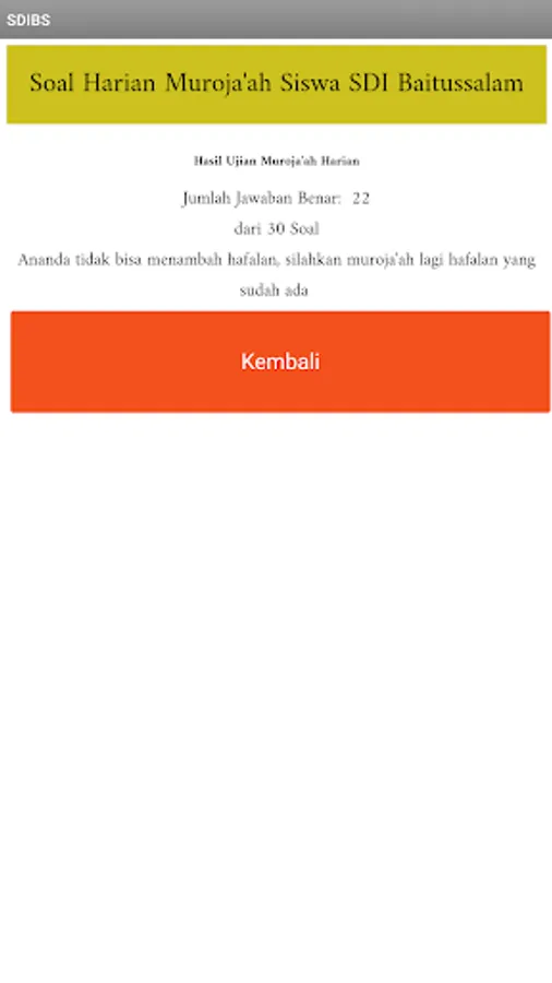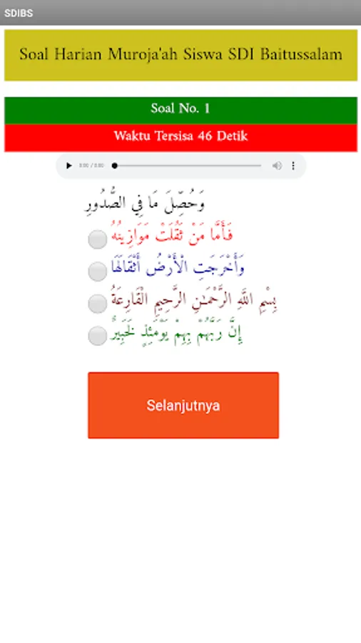 In the process of memorizing the verses of the Koran needed a tool that aims to accelerate and decide (strengthen) memorization of students. This is what made us make the application Tahfidz SDI Baitussalam. For now the application is made only for use in the SDI Baitussalam course. However, if you need it, you can contact support@yar.or.id