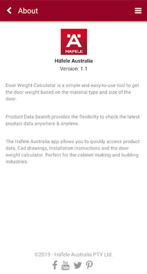 The Häfele Australia app allows you to quickly access product data, Cad drawings, Installation instructions and the door weight calculator.