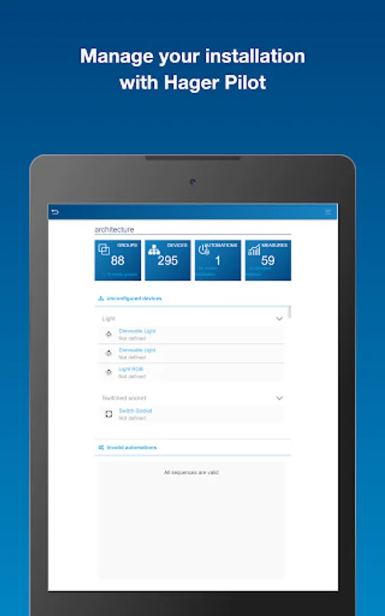 The hager Pilot App is our app for the system integrator or installer to configure our smart home servers. The hager Pilot App can connect to the servers mentioned below via the local network or via the cloud. For access via the cloud, a myHager account and an online connection for the related networked server is required. The following products are currently supported by the hager Pilot App: