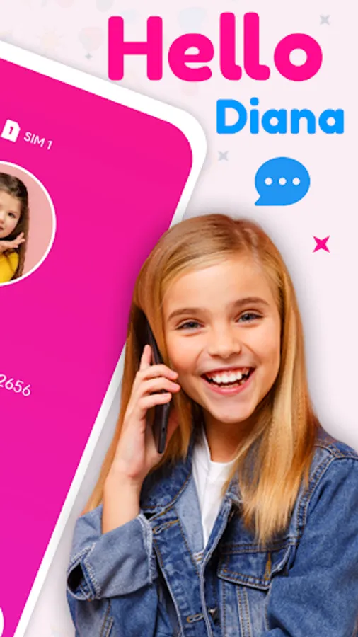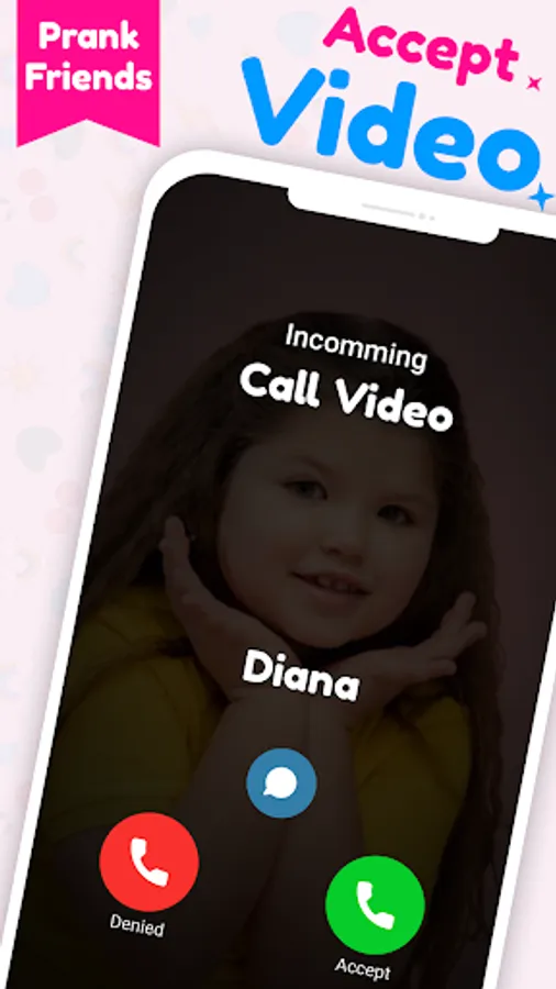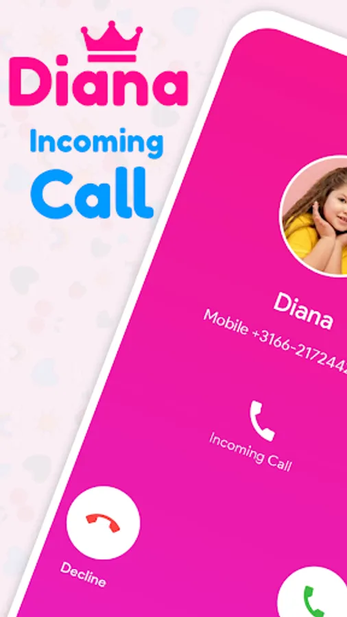 Do you love Diana's call & chat? This application helps you to build a funny simulation to prank your family & friends, by making incoming calls from Diana with amazing ringtone or start a fake chat with Roma and surprise all your friends by starting a Live like real one to meet Diana on video with Roma, and you can make a schedule calls, and get be ready to receive a call from Diana, So this is amazing to make a good prank for all your friends.