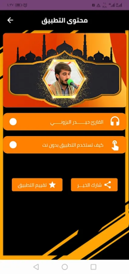 ✅ 🔹 The interface of the reciter program Haider Mohsen Al-Bazuni without the net is very simple, which enables you to use the program with ease and ease, as well as the ease of navigating between the pages of the Quran application, with the voice of Haider Mohsen Al-Bazuni without the net.