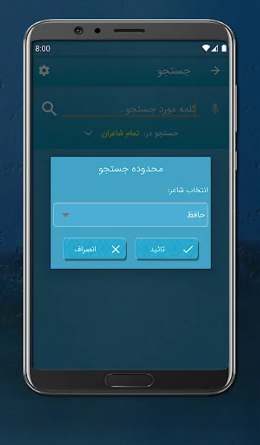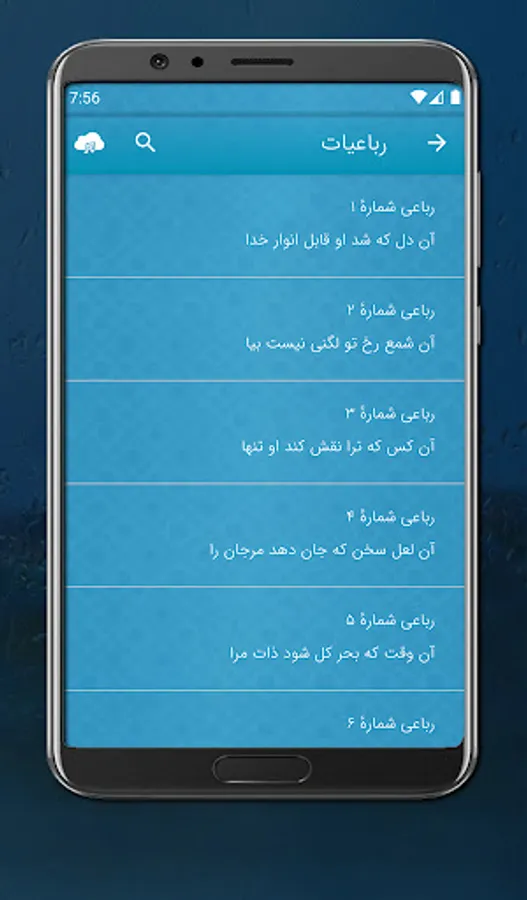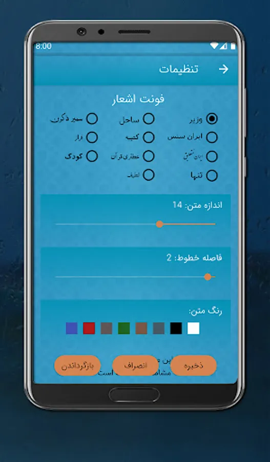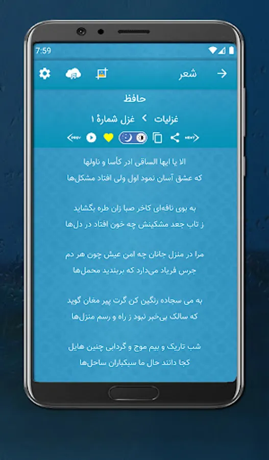 and easily jumping to Next and Previous Poem with buttons. In the setting option, you can change the font and color of the poem with beautiful Persian Fonts and Color Collections, Also you can Increase or Decrease the size of the poem in the setting.