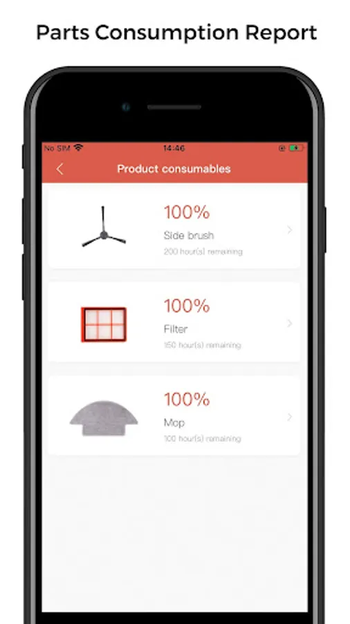 5. Parts consumption report. Filters, mop pads and side brushes have to be replaced regularly. This APP smart reminder displays the usage of parts and will send reminder notifications to your smart phone when parts life is low and when it's time to replace.