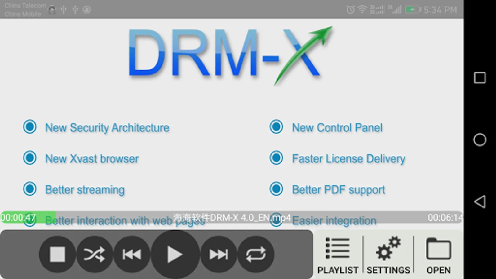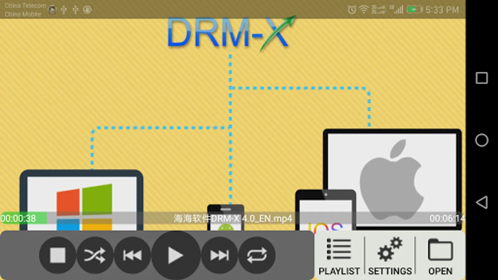 HUPlayer for Android is a powerful media player which supports playing flv, mp4, avi, webm, mp3, mkv, m4a, m4v, aac, 3gp, rmvb, mpg, mpeg and divx formats on Android devices. It also supports playing DRM-X 3.0 protected Audio/Video files.