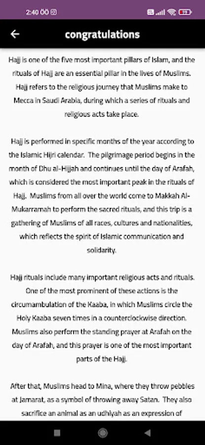 After arriving in Saudi Arabia, the application provides a detailed guide to pilgrims about the services available in hotels, camps, hospitals and other important facilities. It also displays information about mosques, holy places, prayer times, and food arrangements.