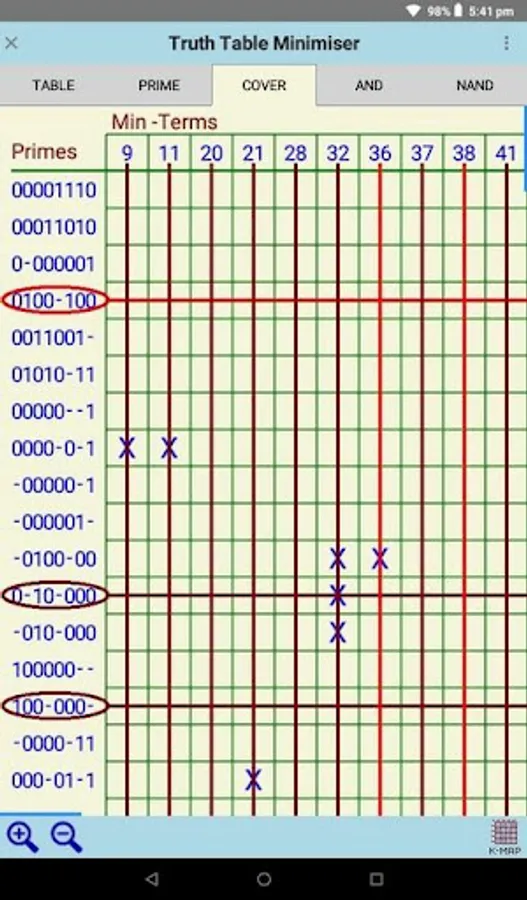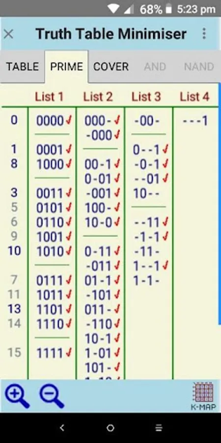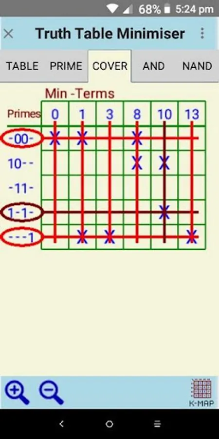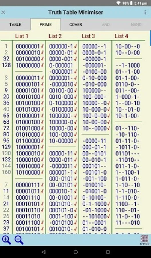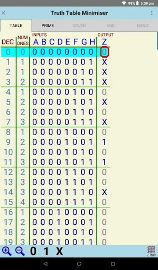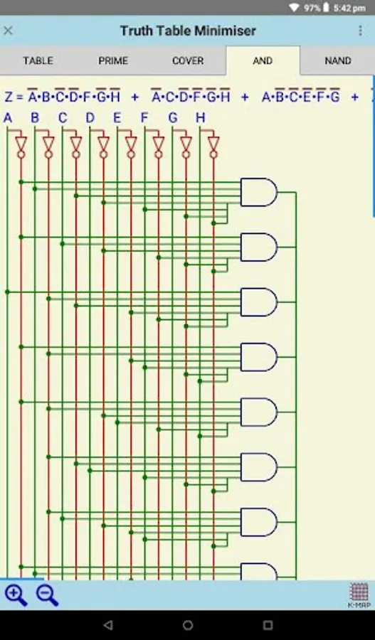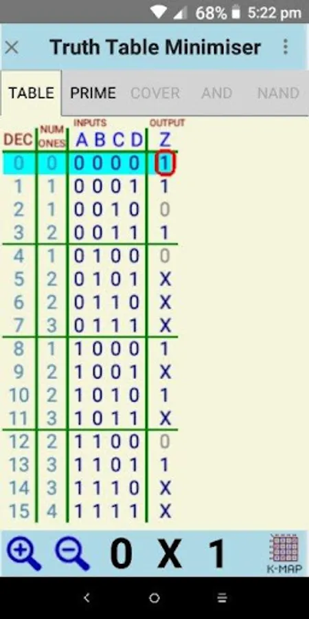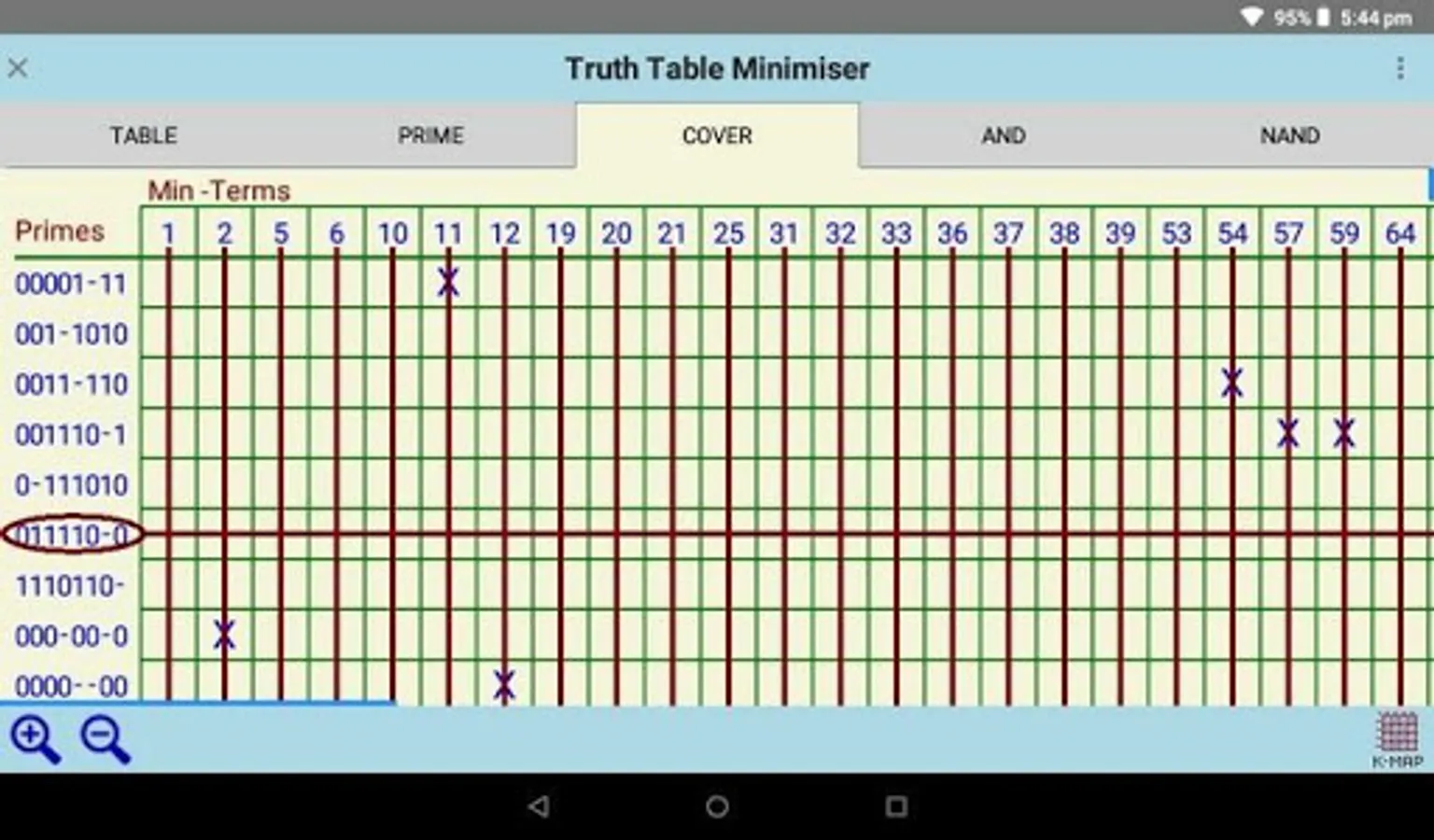 This application is designed to Minimise a Boolean Truth Table (from 2 to 8 variables) to its simplest form, utilising either a Karnaugh Map or the Quine-McCluskey algorithm.