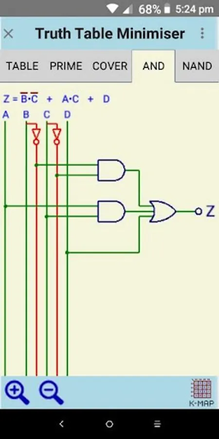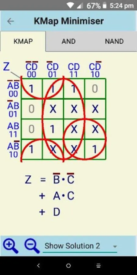 The final digital circuit of the solution is then provided, and the circuit is available in both the AND-OR and the NAND-NAND circuit equivalents.
