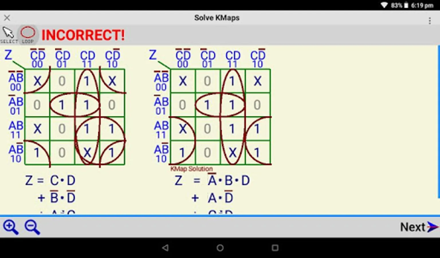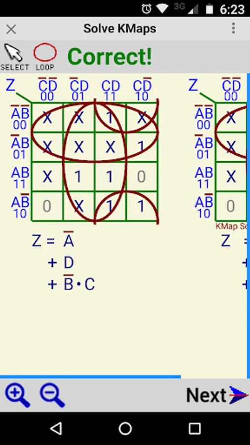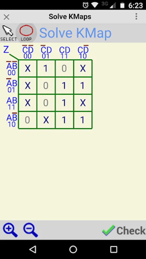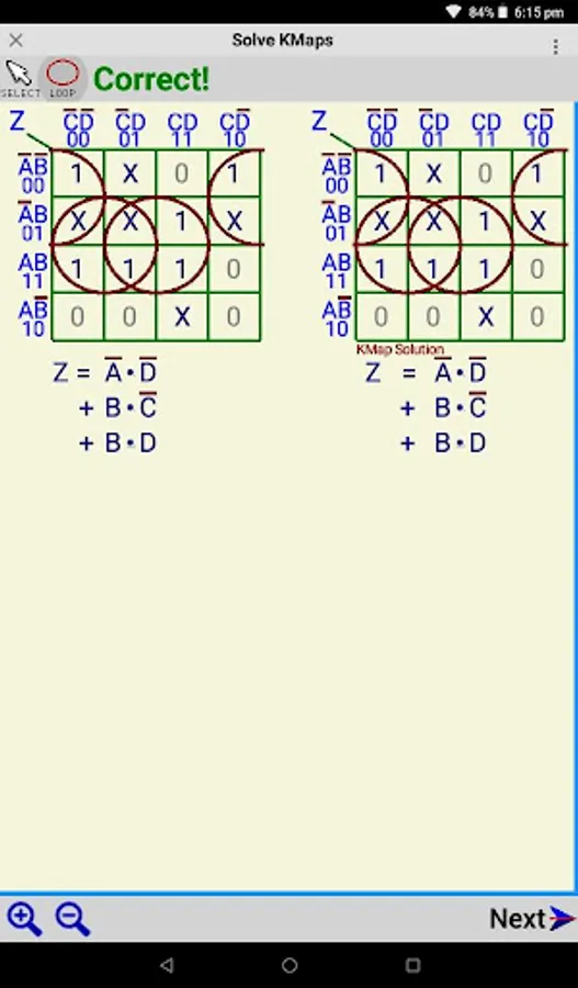 The application presents an unsolved KMap, which the user solves by looping the logic highs (1) and / or the Don't Cares (X). Once the user has finished solving the KMap, the CHECK button will check the solution, and give a CORRECT or INCORRECT message. The application then also displays the correct solved KMap beside the user solved KMap. An option allows the user to successively select all the multiple equivalent minimised solutions for the Karnaugh Map.