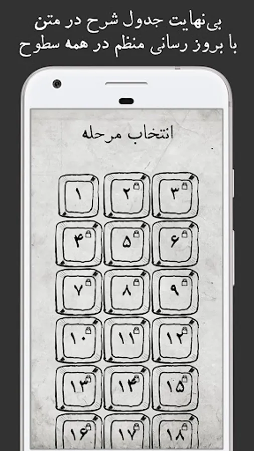 In Infinite Persian Table game, more than 500 Persian tables with different degrees of difficulty have been designed for you, so that by using this program and solving Infinite Persian table, in addition to spending your time solving the table, you can also find your general information. Upgrade.