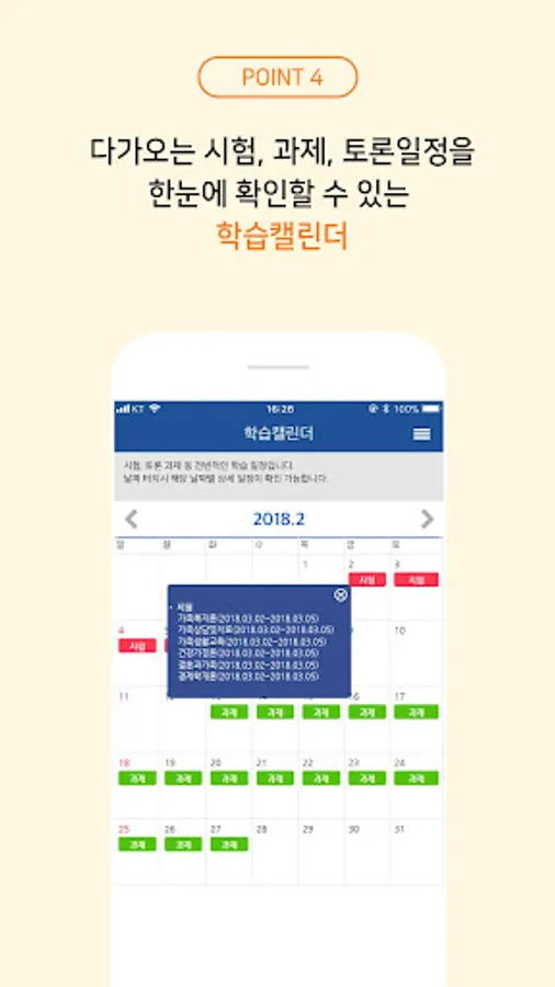 - 다가오는 시험, 과제, 토론 일정등을 한눈에 확인할 수 있는 학습캘린더