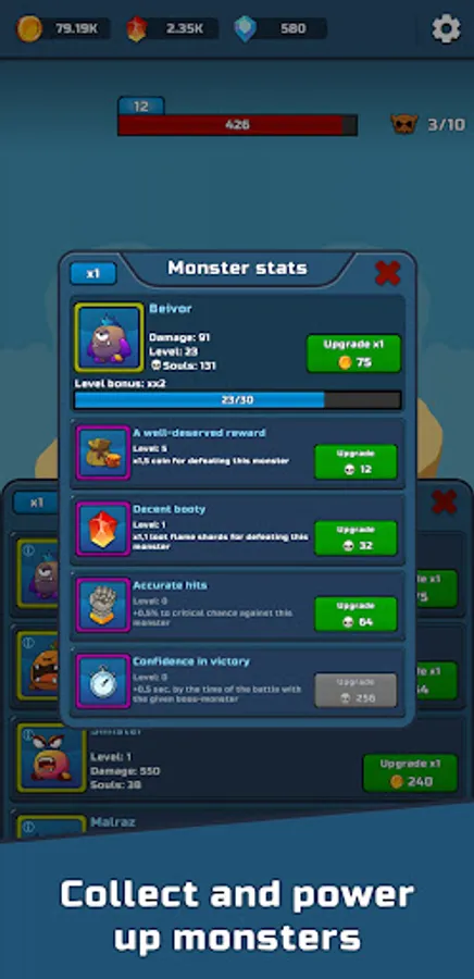 ★ There are various currencies in the game: gold, gems, souls and shards of flame. Try to get all the treasures and find uses for them.