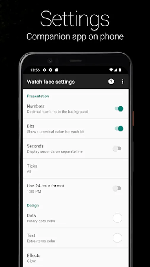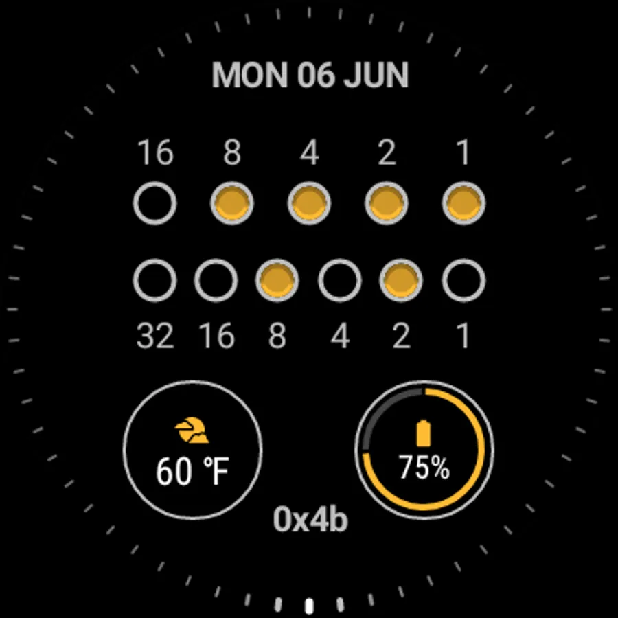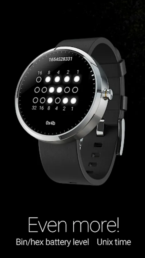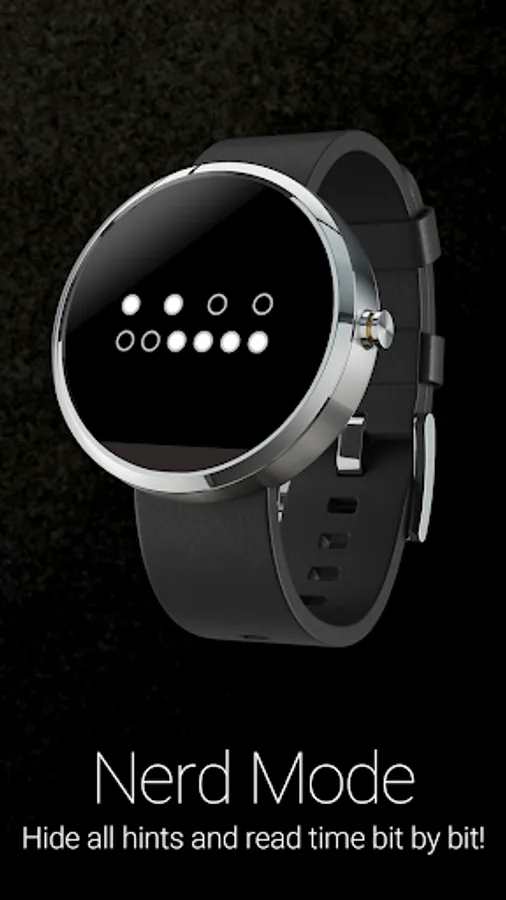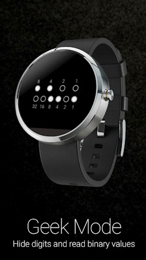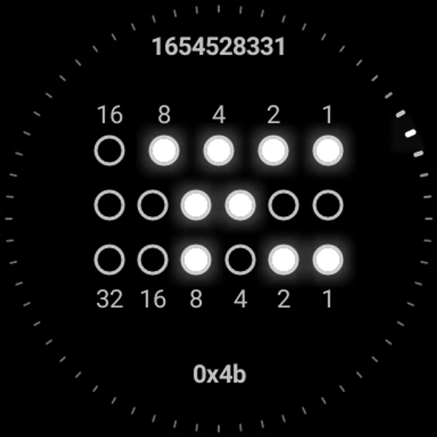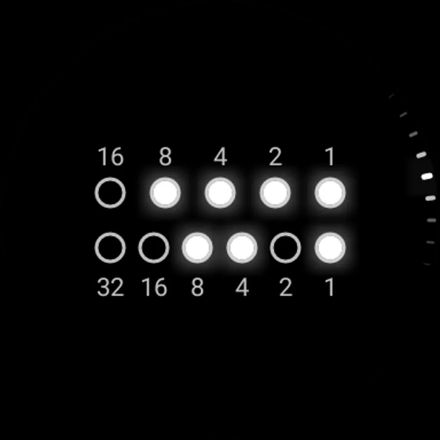 Binary watch face for Wear OS. Decimal numbers are merely hinted in the background.