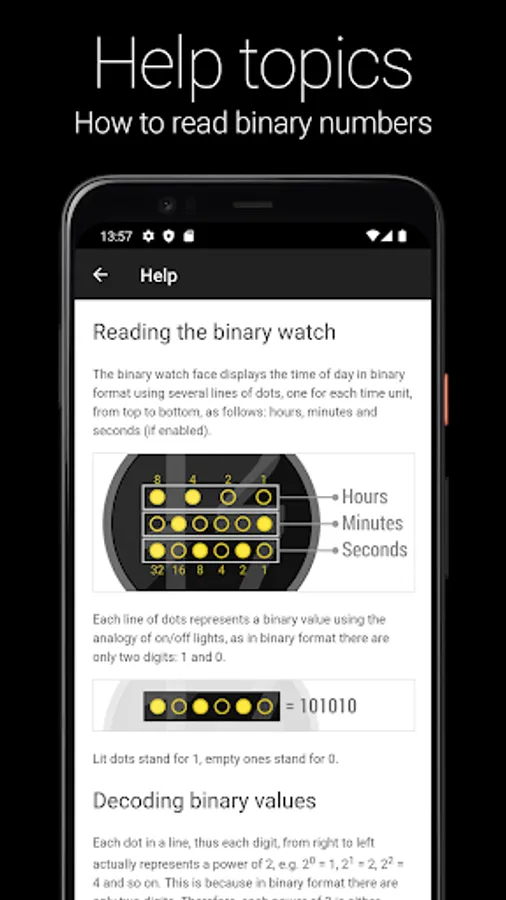 • Help topics for reading the binary watch.