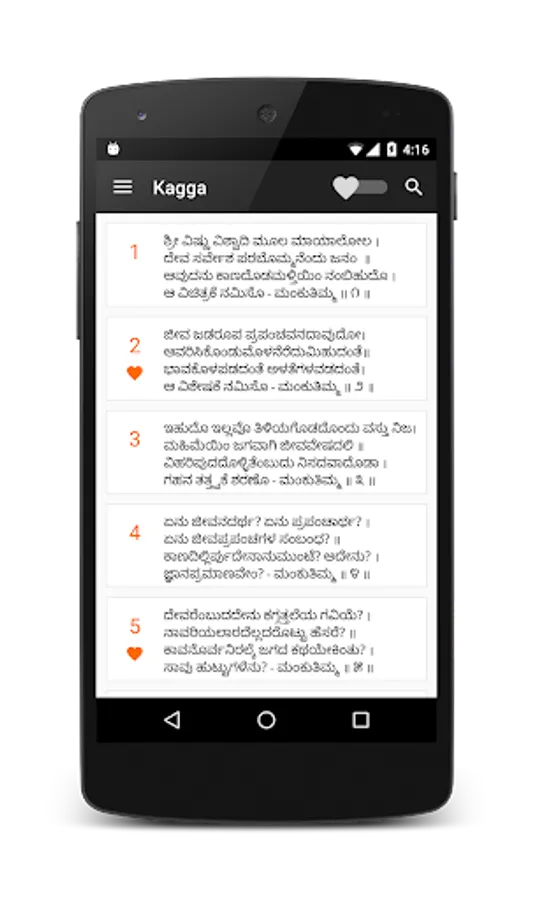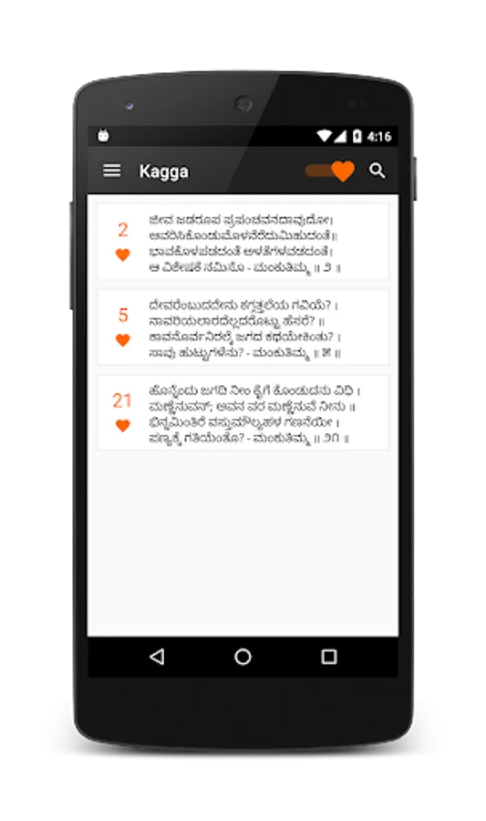Mankutimmana Kagga (beta) application renders on your android phone the priceless gems of wisdom composed by D.V.Gundappa (affectionately known as DVG) - one of the most renowned poets the Kannada language has ever seen. The application contains all 945 verses with the essence translated in English by Prashanth Kota. It also consists of simple kannada word-to-word meaning and essence in Kannada taken from “Kagga Rasadhare” series by Ravi Tirumalai.