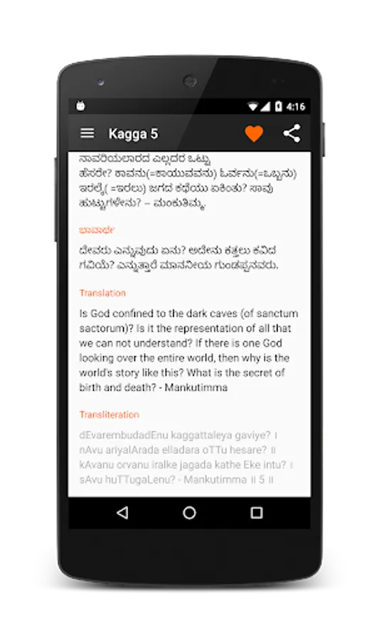 - Absolutely no advertisements. We have developed this application out of love for Mankutimmana Kagga and will never use it as a medium to shove advertisements.