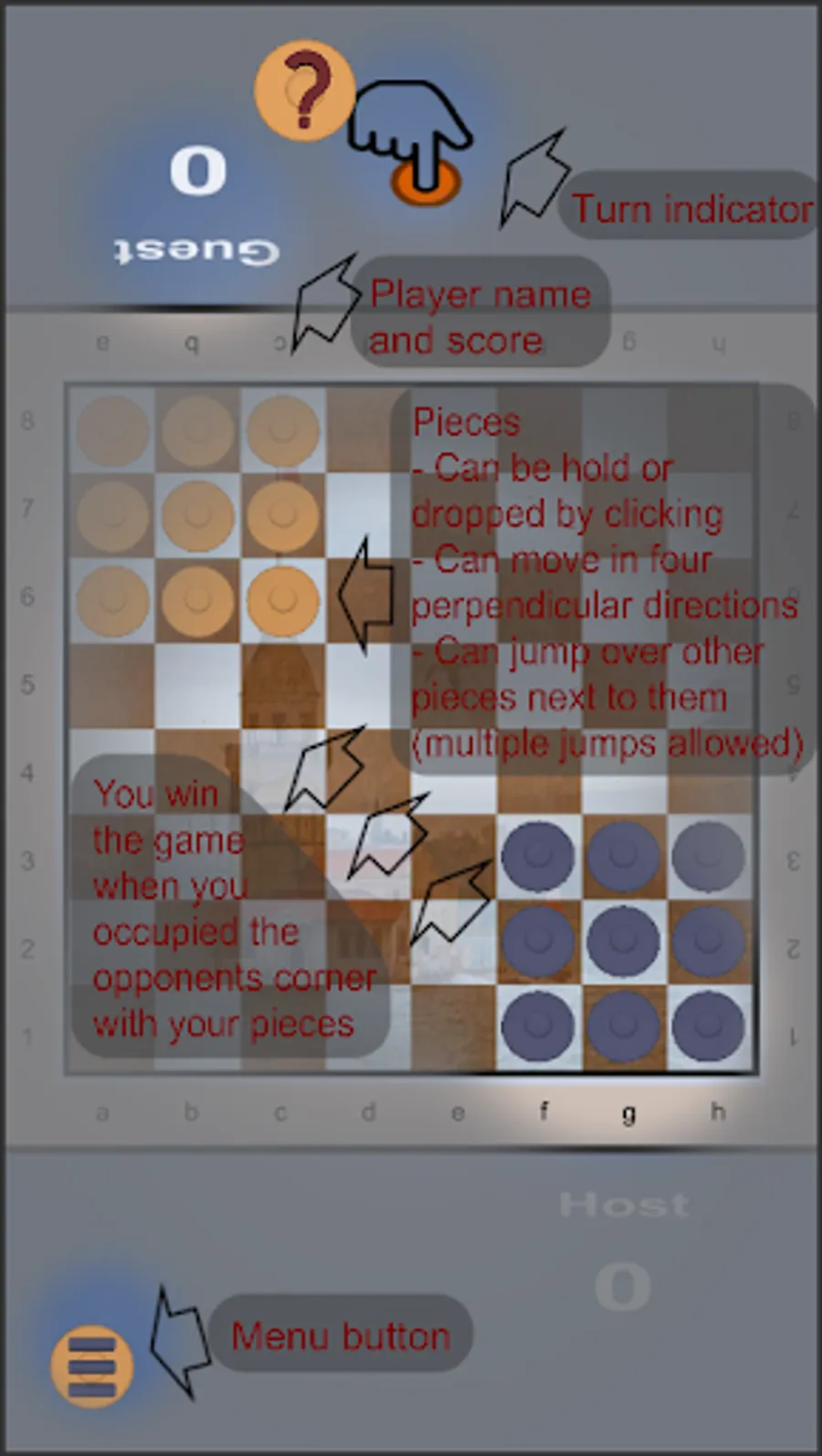 The aim is to collect your 9 coins on the corner of your opponents, namely on your opposite corner.