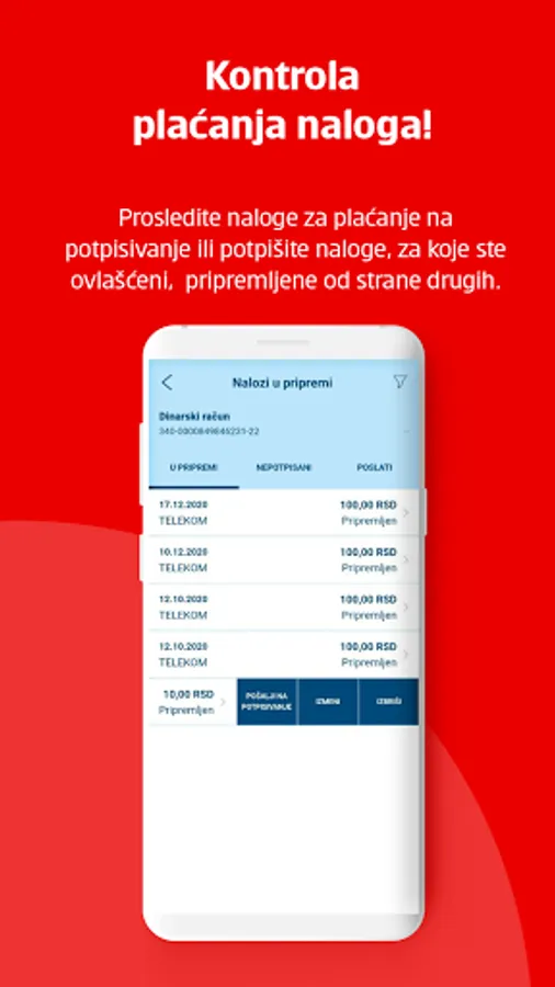 * Jednostavno potpisivanje naloga PIN-om, otiskom prsta ili prepoznavanjem lica u zavisnosti od izabrane metode autentifikacije za pristup aplikaciji,