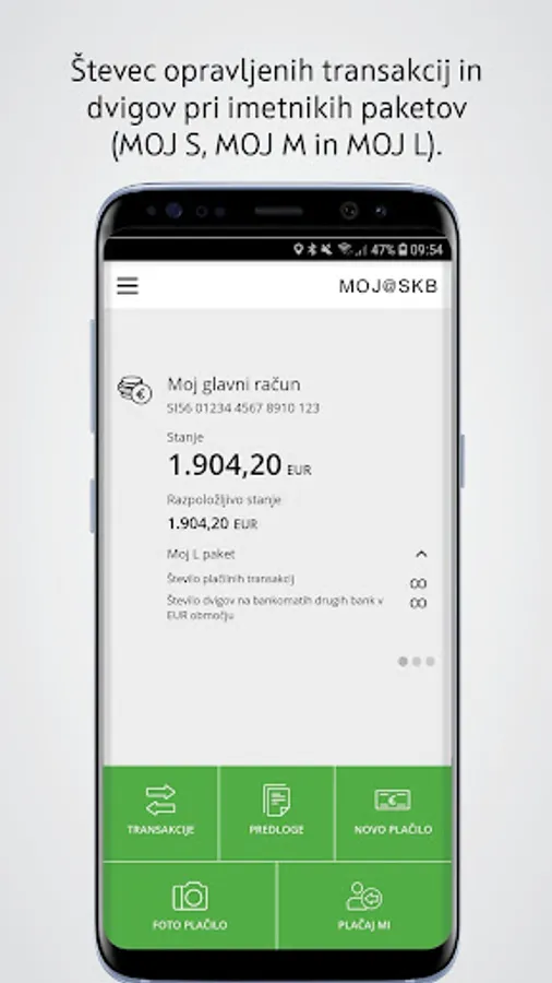 With MOJ@SKB mobile bank, you can perform your everyday banking services at anytime and anywhere by using your mobile device. You can monitor the balance on your personal and card accounts, savings, deposits, and loans, you can perform payments via the UPN order and you can transfer funds to other accounts.