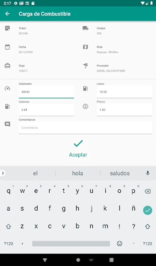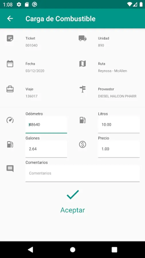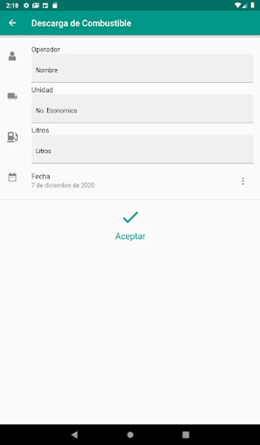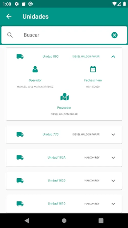 To help fuel control. The information to load the fuel will be available in the app. The dispatcher selects the route and the unit number to refuel. Write down the Odometer and the amount in liters or gallons correctly and send to the server: for the company to process the information. It also helps to unload fuel from the truck to the tank will note the operator, the number of trucks and liters that are discharged. Users are registered on the server by the administrator.