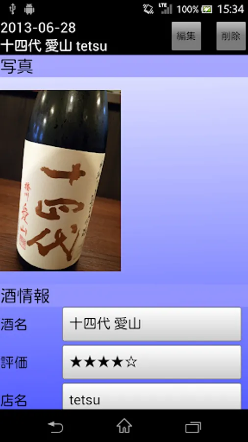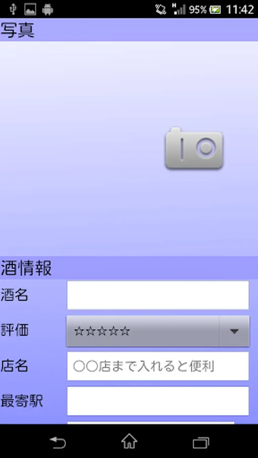 酒名、評価、店名、最寄駅、値段、種類、注文単位、メモの情報を入力して登録できる。