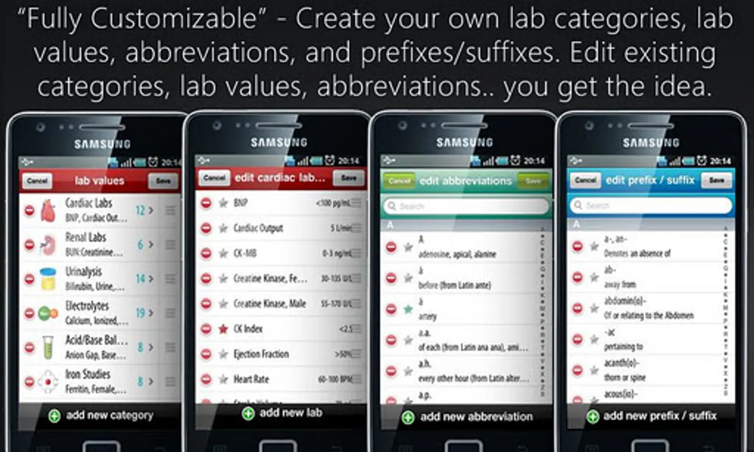 What separates us from the rest of the Lab Values apps? Our app is fully customizable. All of the data contained in 3 in 1 Lab Reference if fully editable, so go ahead and customize it to suit your needs or add notes to an entry.