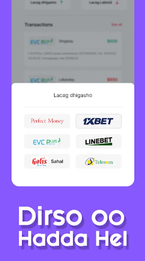 EvcPlus, Jeeb, E-Dahab, E-Sahal, Golis, 1Xbet, Linbet, Betwinner iyo Perfect Money