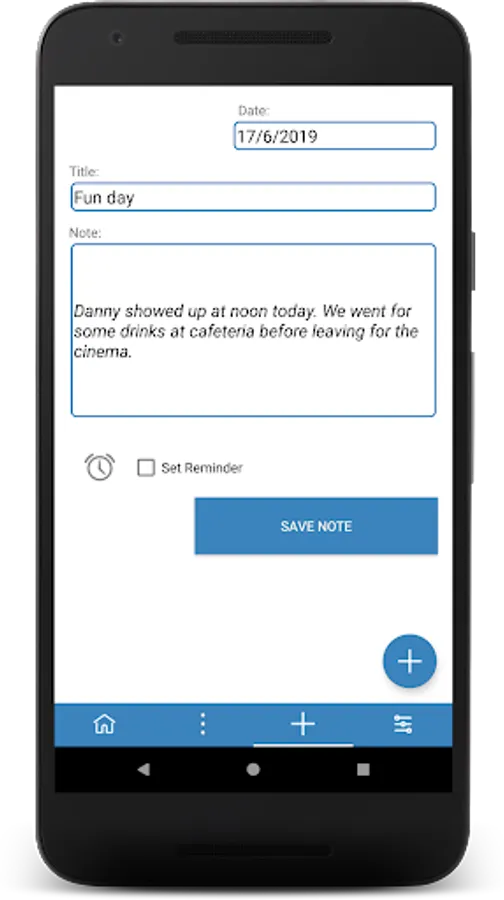 It is those things which we might not have someone to remind you of that should scare you the most. These are the important details like application numbers, serial numbers and descriptions, personal goals and secret passwords which can make you stuck at the airport, stuck when filling a form, or lost when getting a friend's address or a piece of intimate information. In order to avoid these unwanted situations, this app was created to serve as your companion by being a diary with a reminder for each note you want.