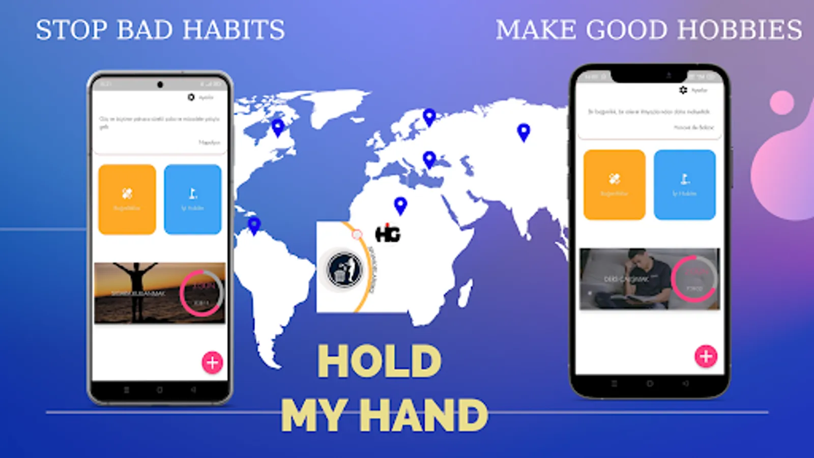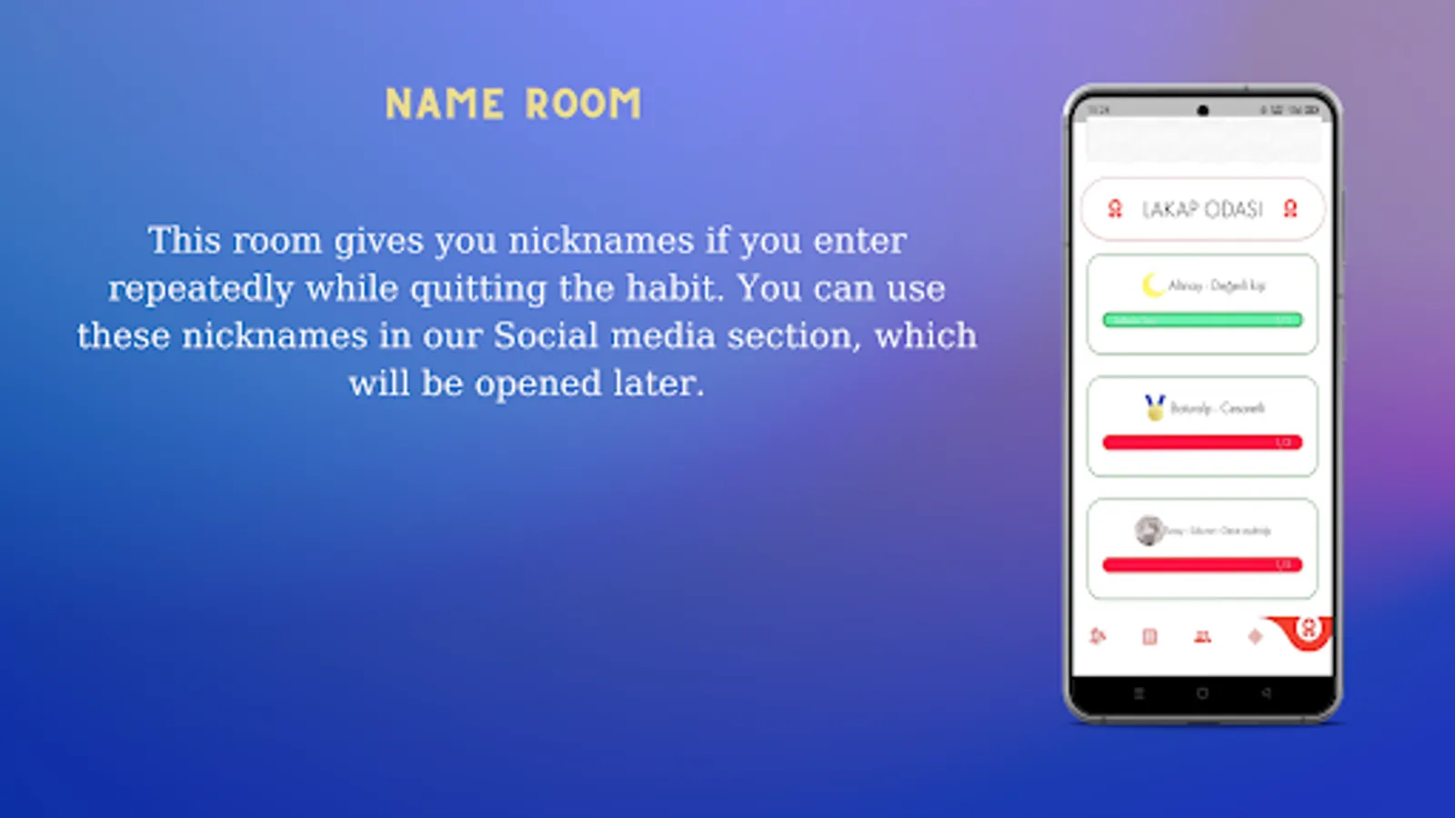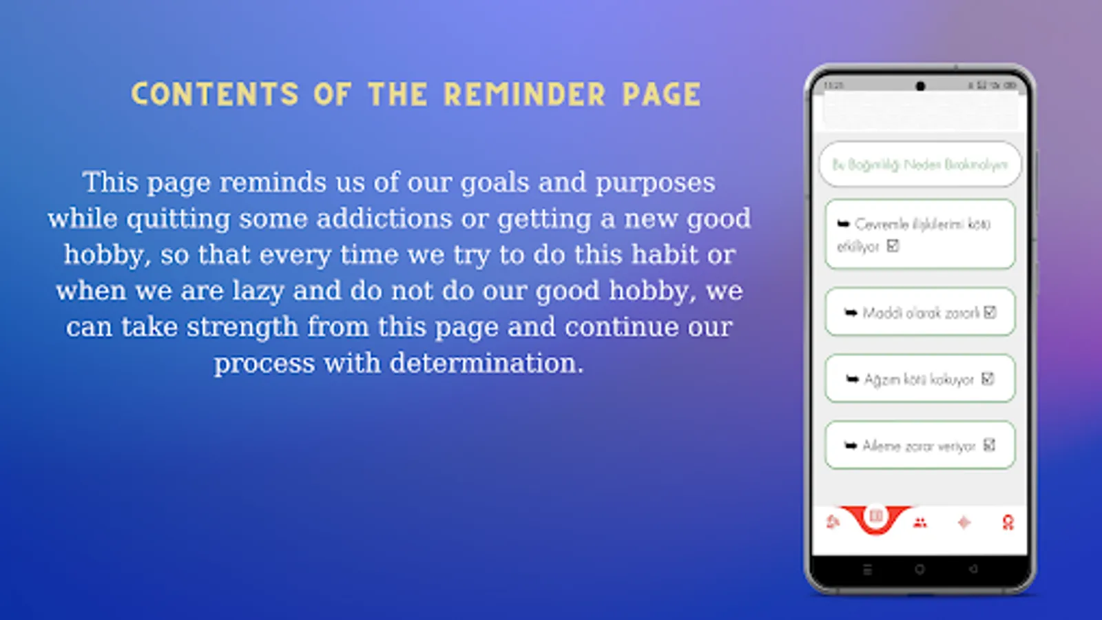 The purpose of the application is to get rid of bad habits and to acquire good habits. With the application, you can quit smoking or get a habit of studying.