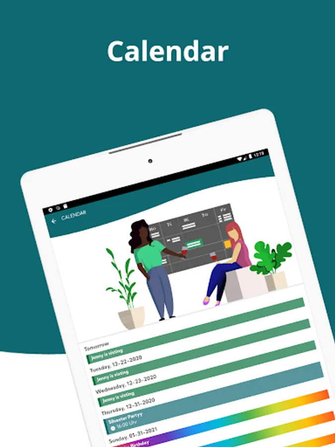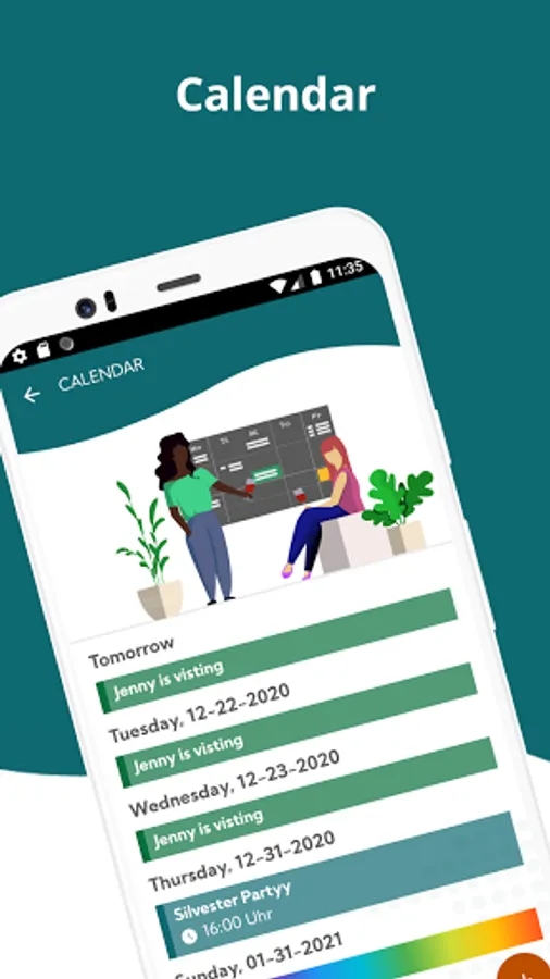 FlatUp! provides you a shared calendar, where you can enter events, absences, visitors or birthday reminders.