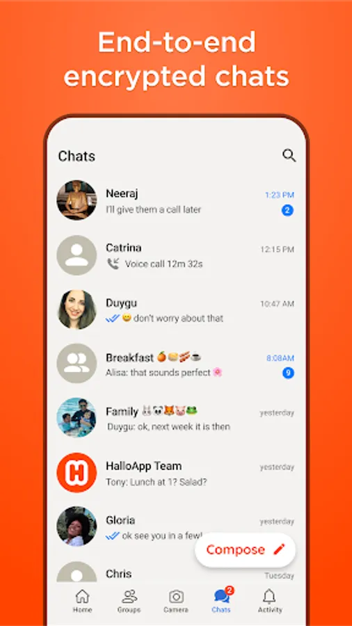 Your chats are end-to-end encrypted. No one outside of your chats can read them, not even HalloApp.