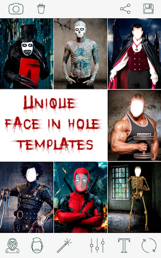 Make yourself a zombie in a second, become a popular Halloween character or turn into a famous hero with our Halloween photo editor.