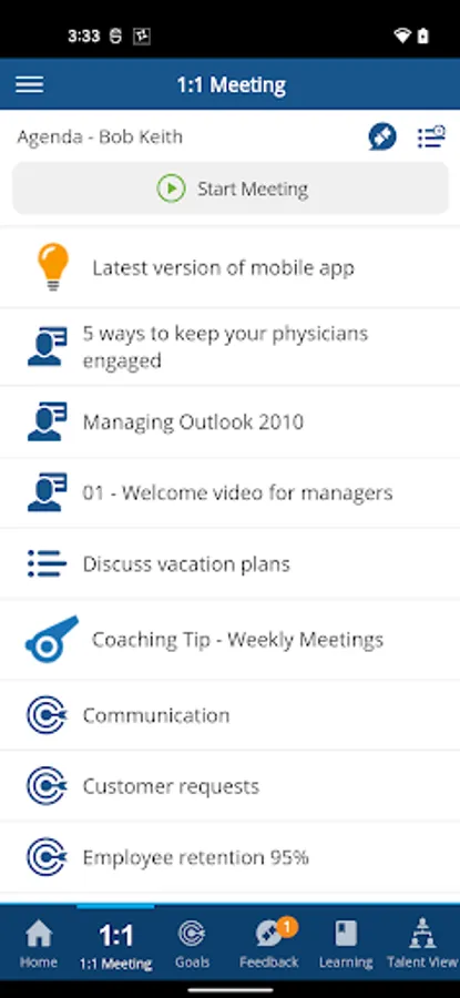 * Participate in and capture notes from 1:1 meetings anywhere, anytime. Track start and end of meetings, navigate agenda, view topics and add comments.