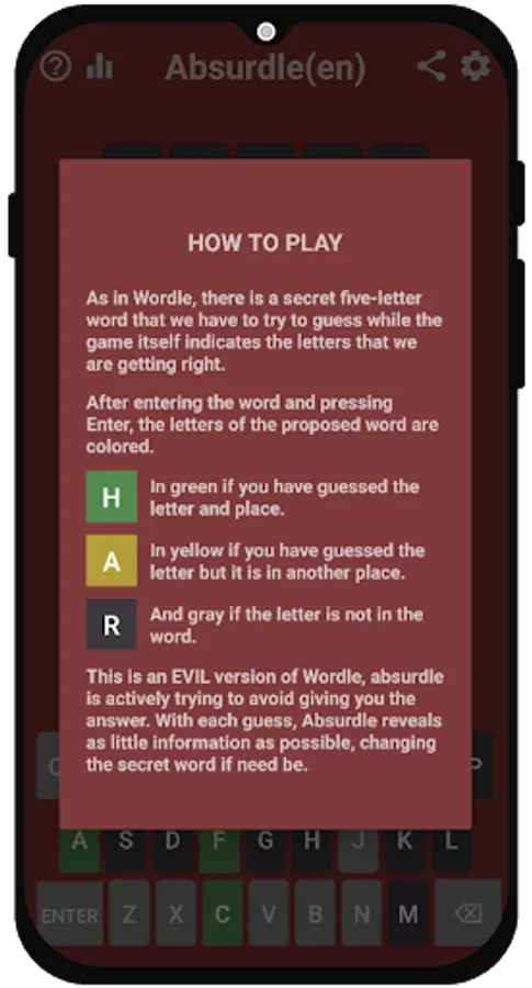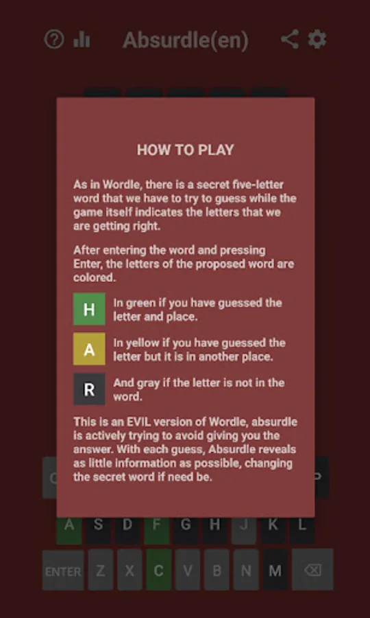 This is an EVIL version of the Wordle, absurdle avoids giving you an easy answer. With each try, Absurdle reveals as little information as possible, changing the secret word if necessary.