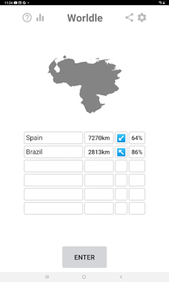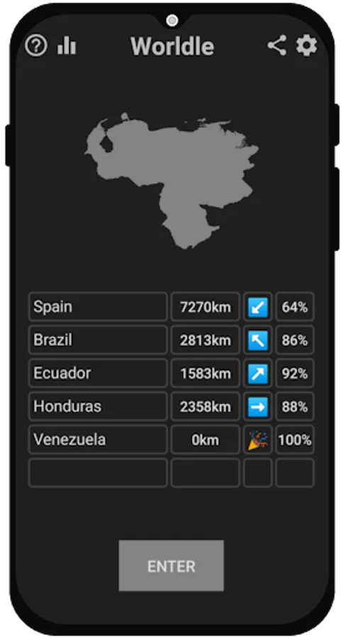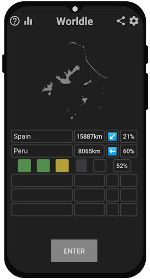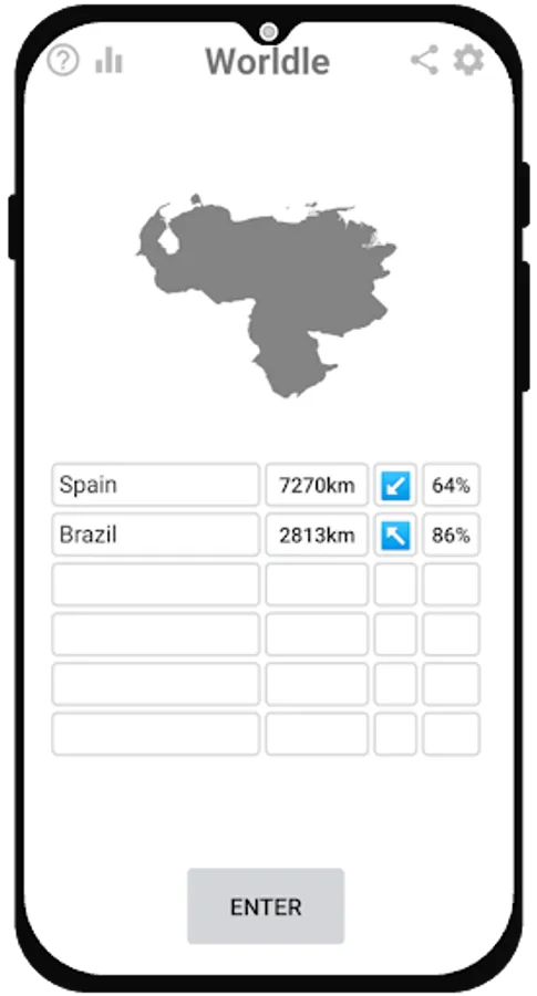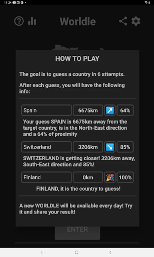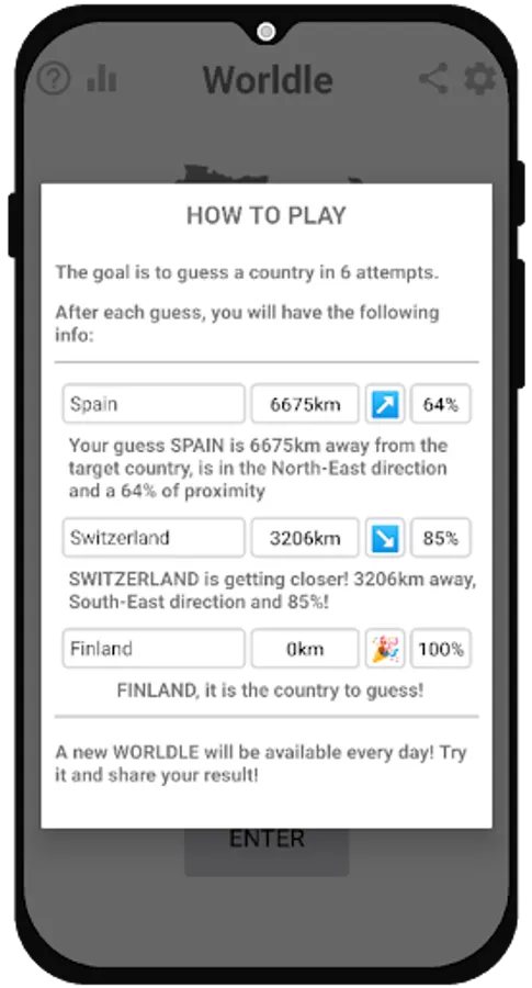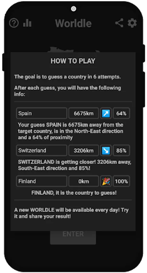 After typing a country and pressing Enter, you will be shown the following information as hints for you to find the target country: