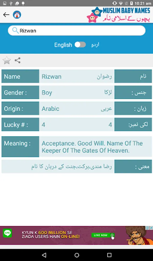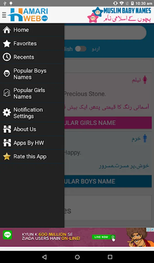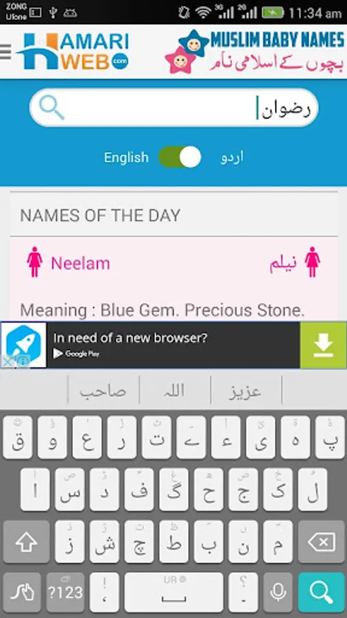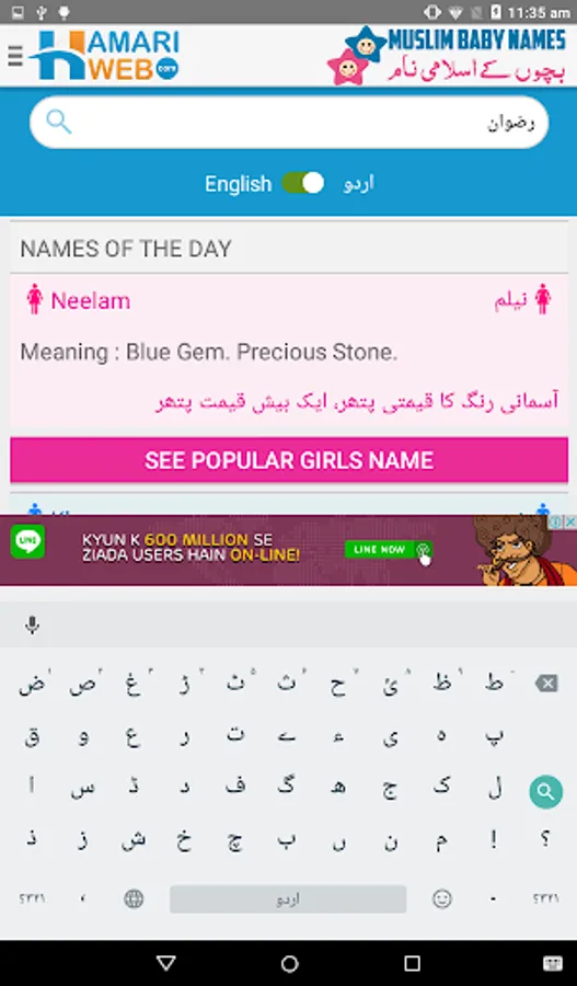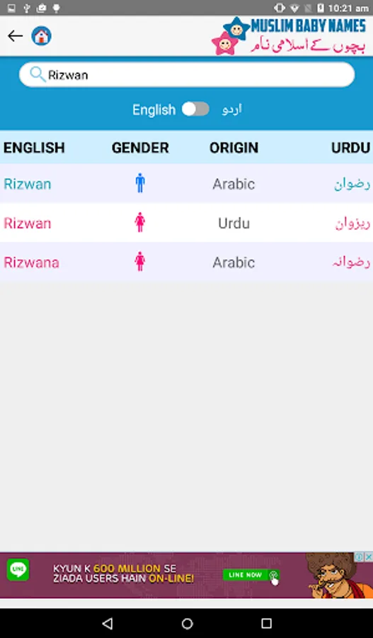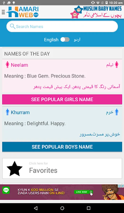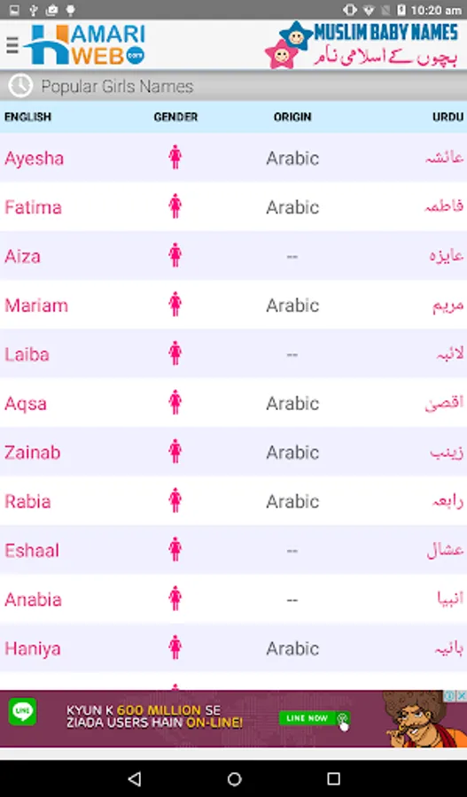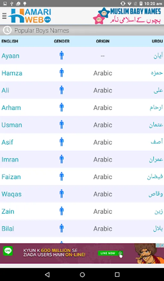 Download Hamariweb Muslim Names & Meaning App and get access to the Largest collection of Muslim Baby Names meanings in Urdu & English both languages. Each name contains the information of Gender, Origin of the Name, Lucky Number, Meanings in both English and Urdu languages.
