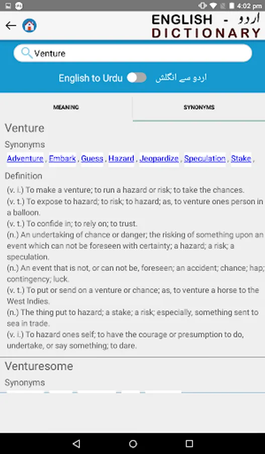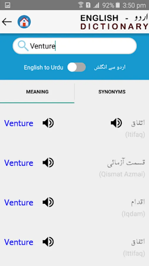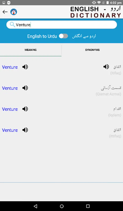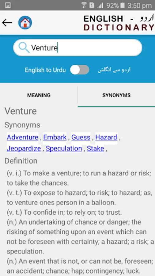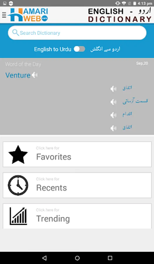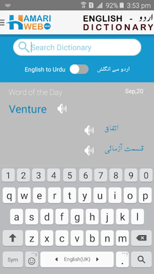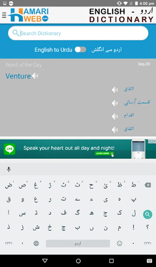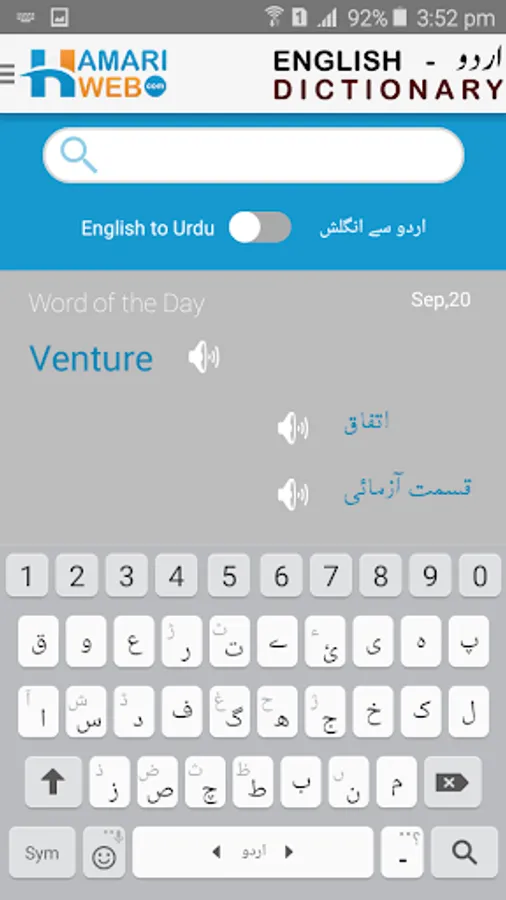 Hamariweb’s English Urdu Dictionary contains the largest data on internet with over 120000 words (and growing everyday). This app is easy to use on your Android Devices, you have the advantage of dual language translation either from English to Urdu or writing in Urdu and then find a particular word in English along with Defination and Voice Pronounciation in English & Urdu – in a very convenient way. You may also use Desktop version as for Urdu translation in seven more languages by visiting at http://hamariweb.com
