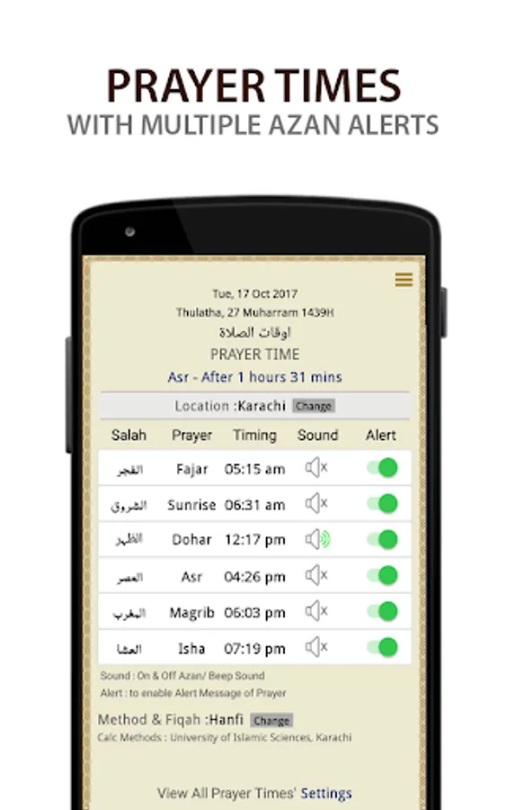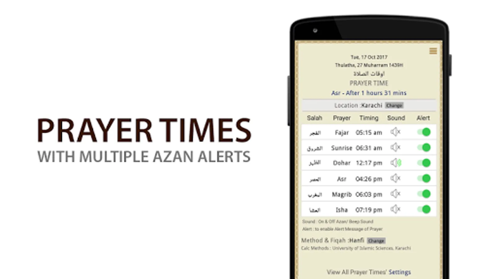 • Prayer Times (Salah Times / Namaz Times / Salatuk صلاتك) with multiple options of Azan Alerts