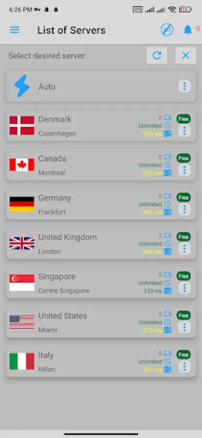 location (no need to close the existing connection first). The app can also select the best performing server for you automatically