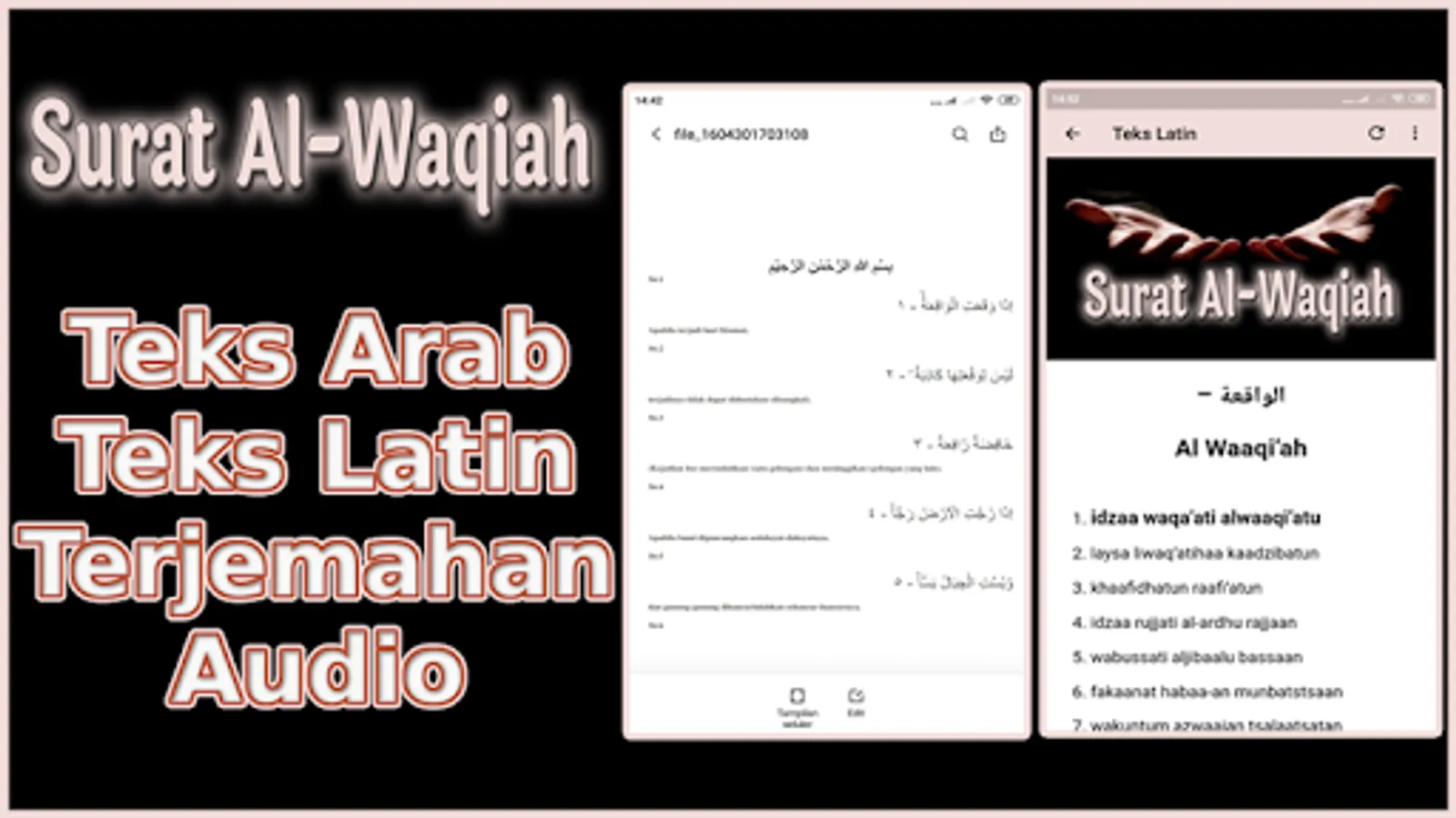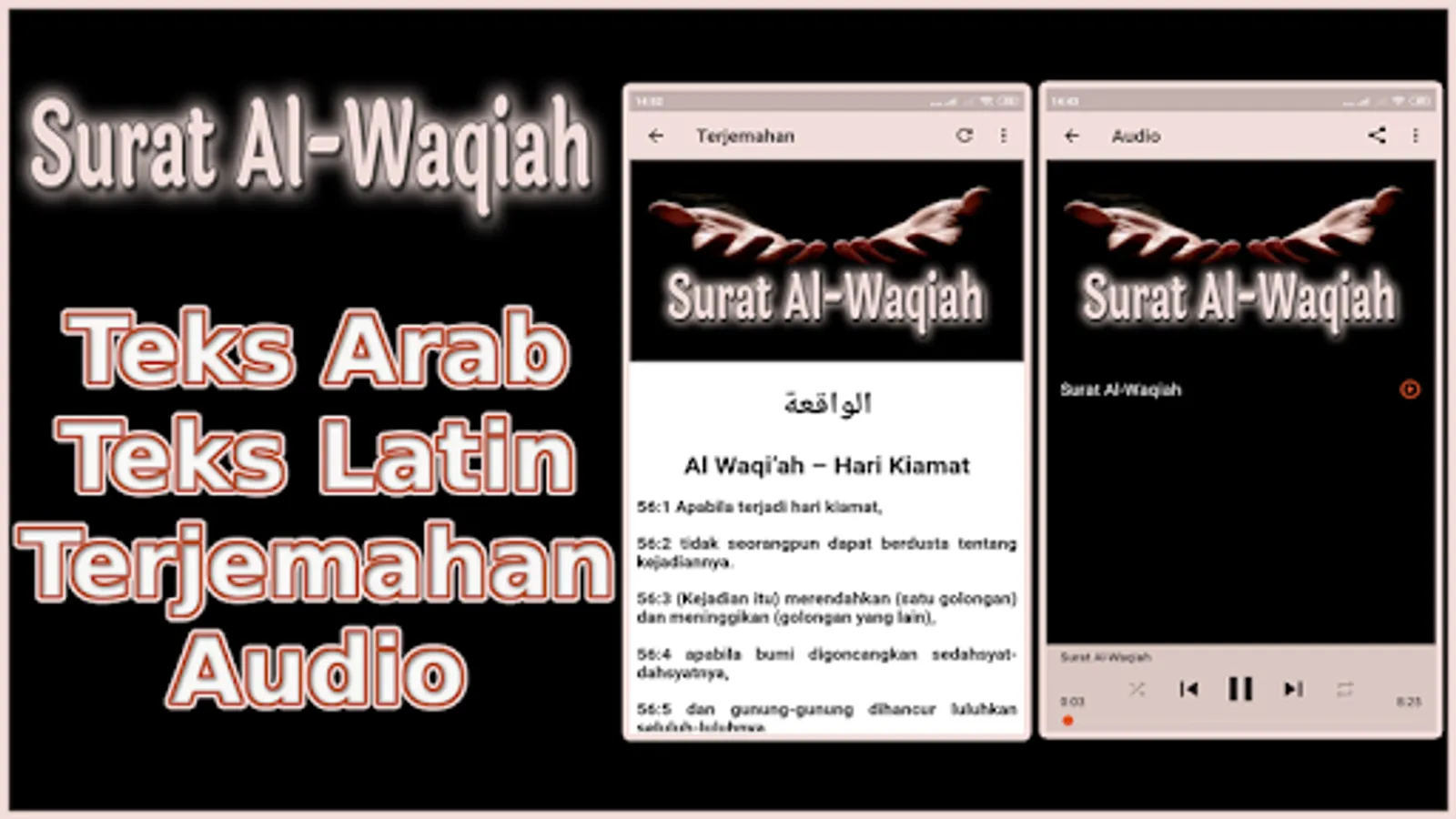 Inside the Surah Al-Waqiah Latin & Audio application contains Arabic Text of Surah Al-Waqiah, Latin Text of Surah Al-Waqiah, Translation of Surah Al-Waqiah, and Audio of Surah Al-Waqiah making it easier for you if you don't have time to read the Al-Qur ' at home.