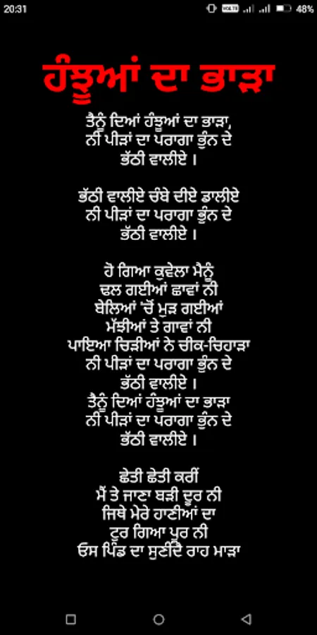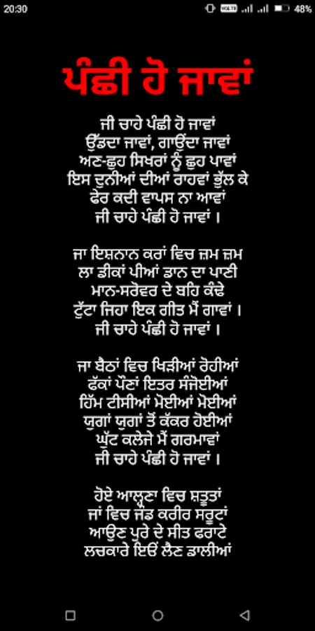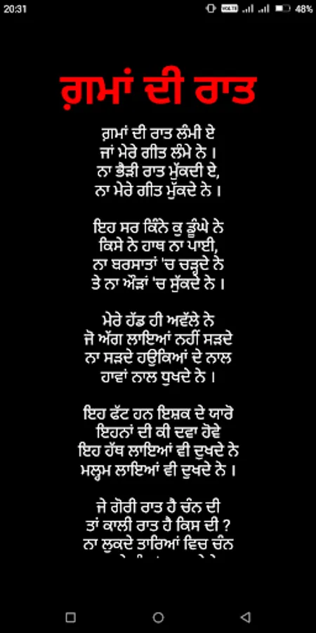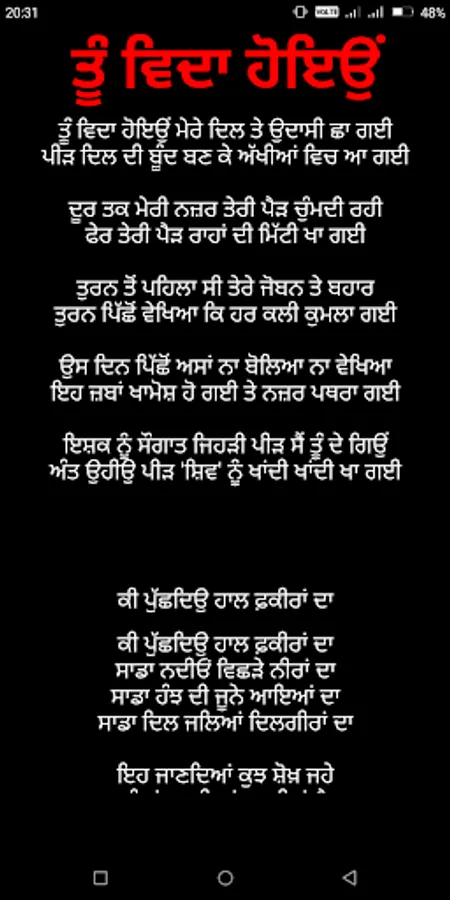 This app contain all poems of his 6 books ie Peedan da Paraga, Lajwanti, Aate dian Chidian , Mainu Vida Karo , Aarti , Main te Main and complete collection of songs written by Shiv Kumar Batalvi.