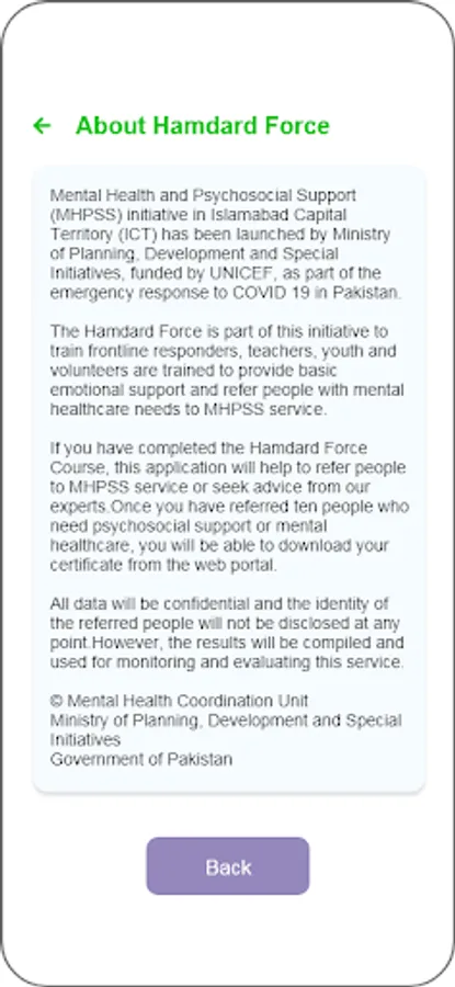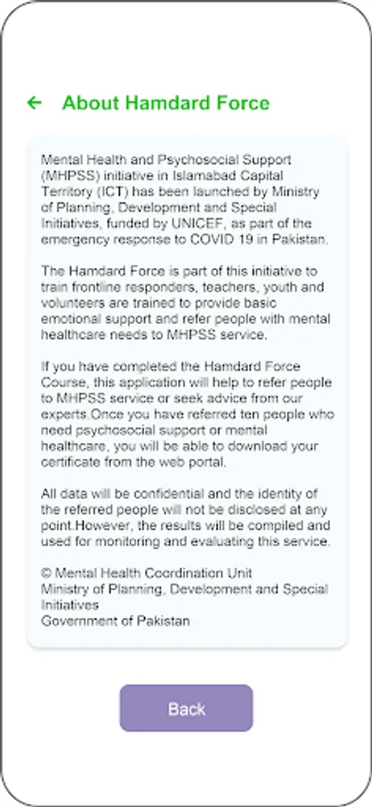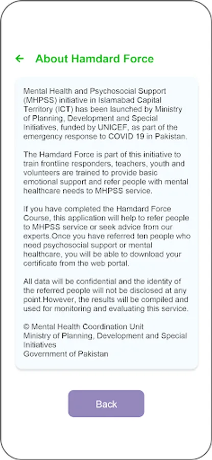 The App allows the user to connect to MHPSS experts (MHPSS means Mental Health and Psychosocial Support) to seek advice and to refer people who might need help. This app is initially intended to be used by 1000 users, who are selected by the project team.