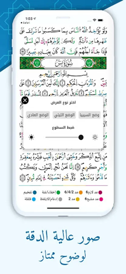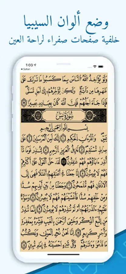 - Sepia mode: where the background of the screen is yellowish and there is no color in the Qur’an in order to give the user more comfort in reading, and in this case we have removed the color key from the bottom.