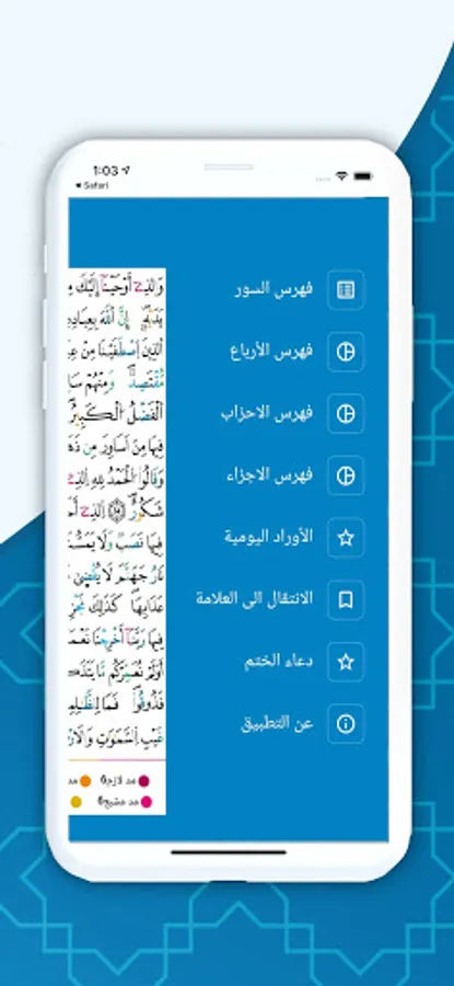 When you click on the screen once, a set of basic screen options appears, which are the name of the surah, the number of the party, and the part that you are in in addition to the search icon that by clicking on it, you can search with any word to show all possible results and if the user wants to obtain more accurate results for the search, then what? He should only write as many words of the verse as possible in the search field. We also have an icon of the main menu, through which the main menu is accessed, which in turn contains a group of important indexes, including the Surah index, the index of the chapters, the index of parts, and other important abbreviations and indexes.