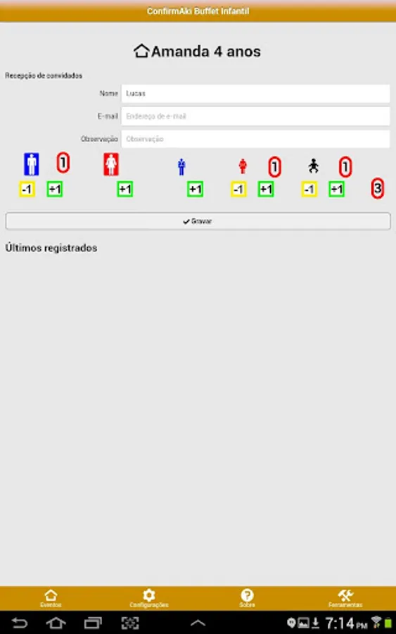 A great auxilar for companies that promote children's buffet parties. With this app you register the name of the guests and tells the number of people per track. At the end you have the resume and the amount to be charged to the party host.